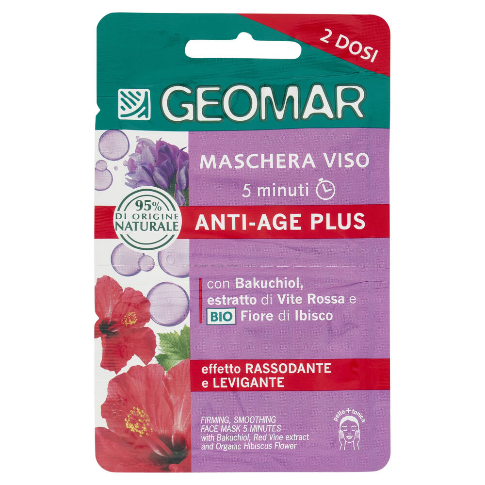 I prodotti Geomar Viso sono formulati con almeno il 95% di Ingredienti di origine naturale, in parte ottenuti da agricoltura biologica, per garantire alla pelle un'azione delicata, ma efficace. La Maschera Viso Anti-Age Plus, è un trattamento specifico che in soli 5 minuti aiuta la pelle a ritrovare elasticità, minimizzando l'insorgere dei radicali liberi. * La sua formula con Bakuchiol, estratto di Vite Rossa e Bio Fiore di Ibisco, arricchita con Acido Ialuronico e Fitocollagene è ideale per aiutare la pelle a ritrovare un aspetto più tonico e rassodato. La sua texture setosa e il suo profumo elegante e fiorito rendono questo trattamento una vera coccola per tutti i tipi di pelle.