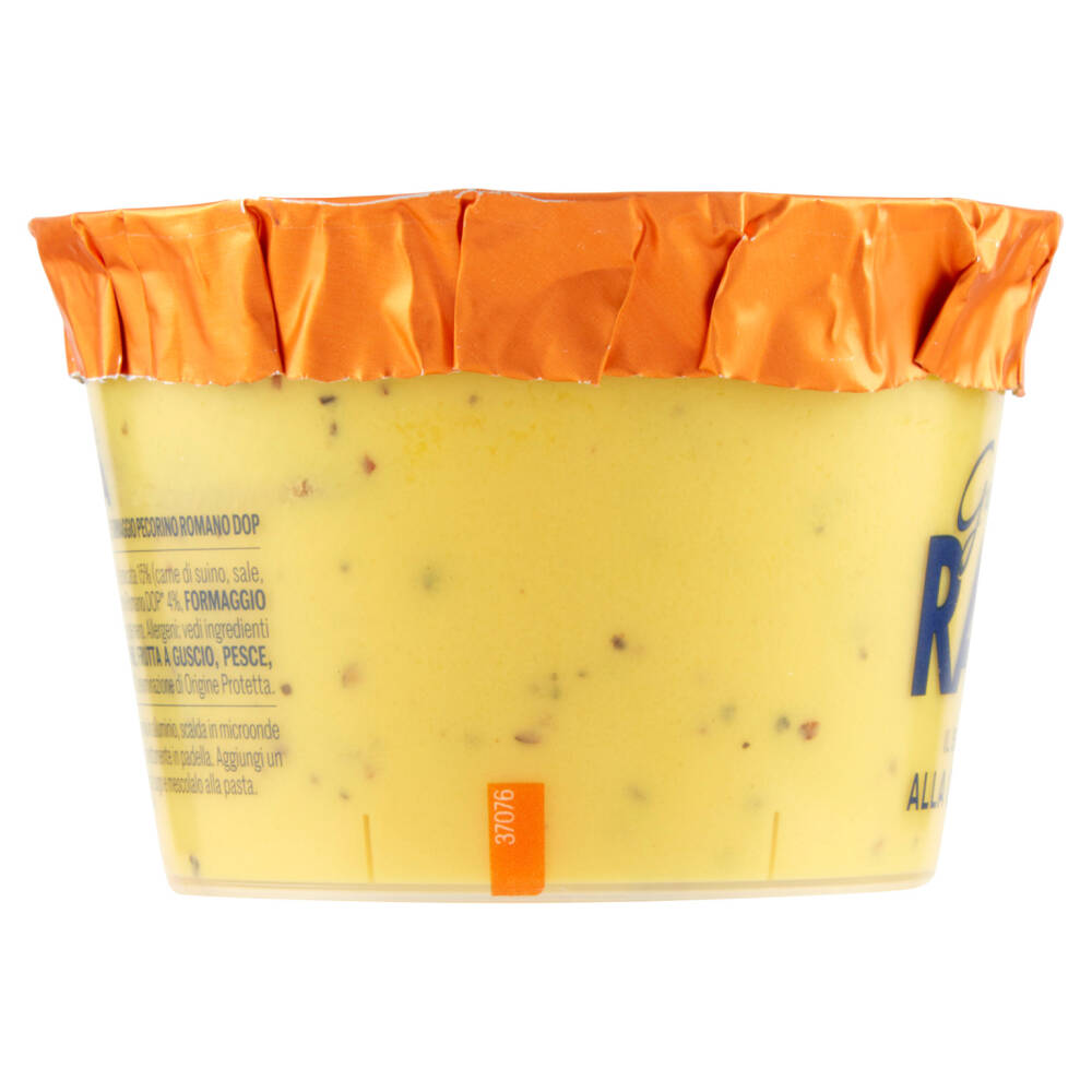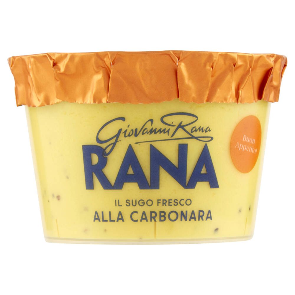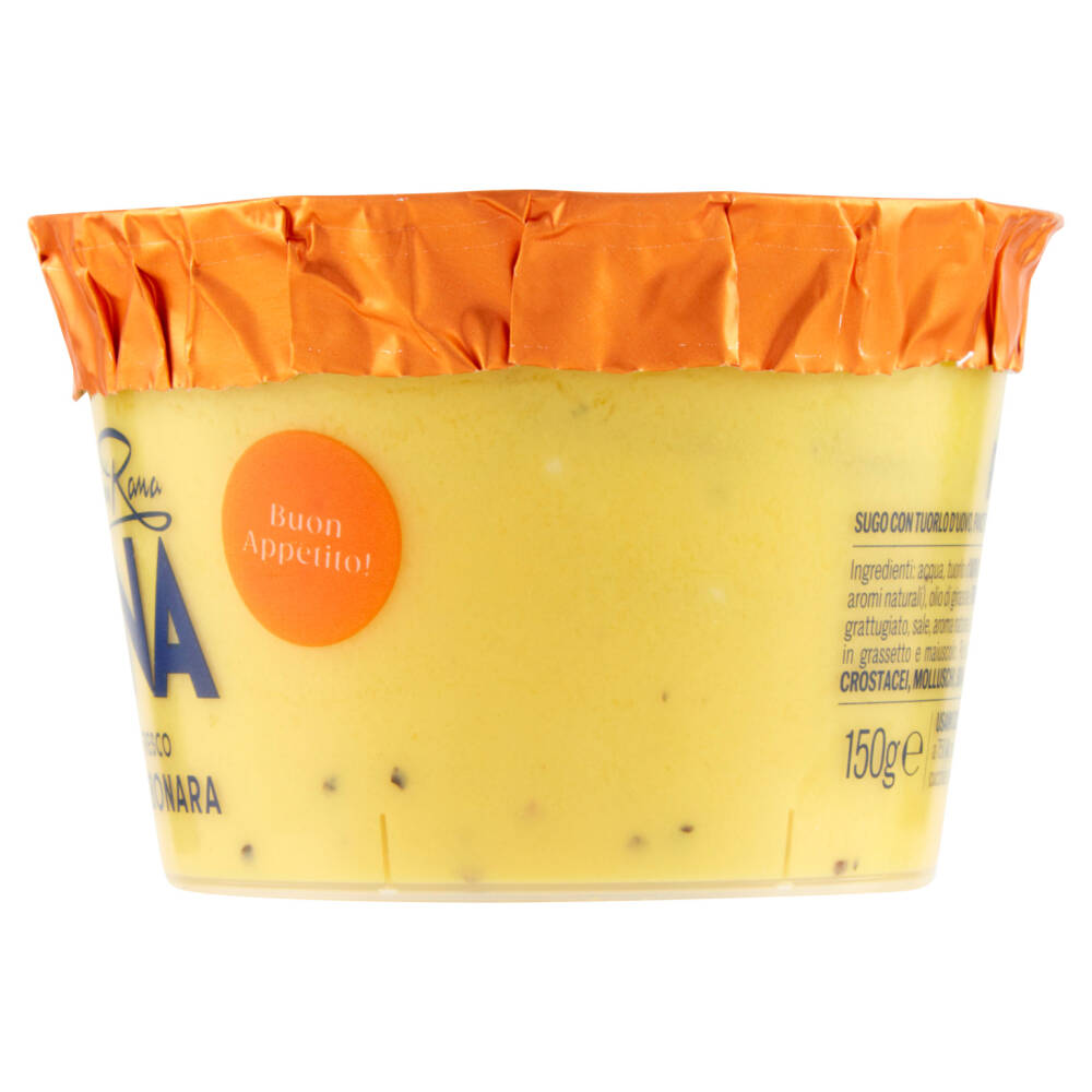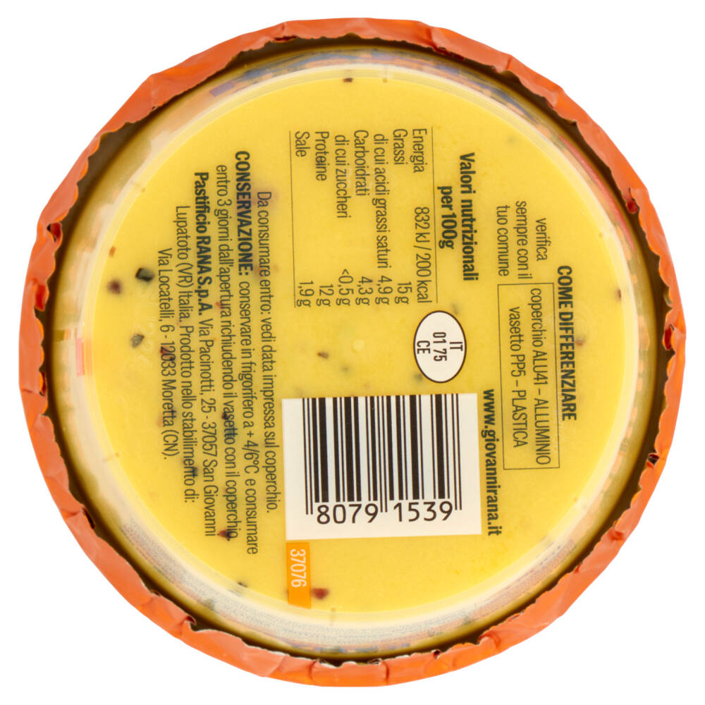 Acqua Tuorlo d'uovo 21% Pancetta affumicata 15% (carne di suino, sale, aromi naturali) Olio di girasole Formaggio Pecorino Romano DOP* 4% Formaggio grattugiato Sale Aroma naturale Curcuma Amido Pepe nero Può contenere glutine, frutta a guscio, pesce, crostacei, molluschi, soia, sedano *DOP: Denominazione di Origine Protetta