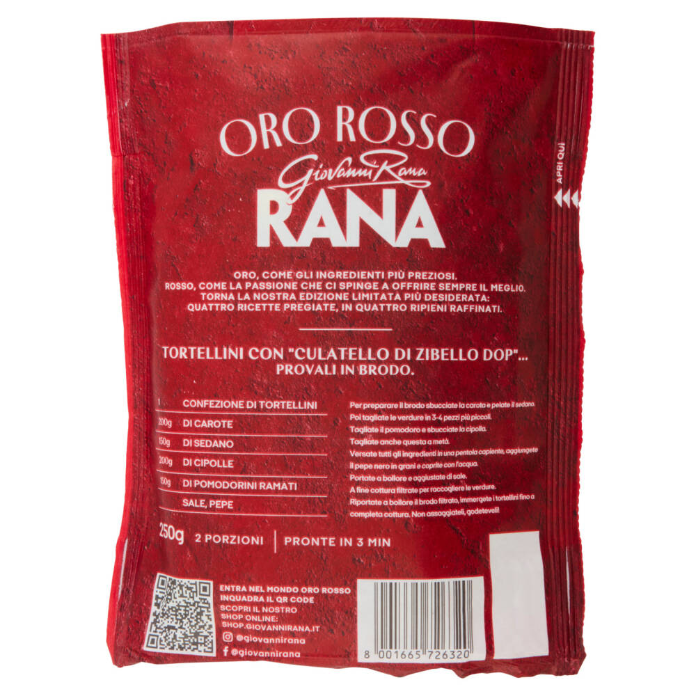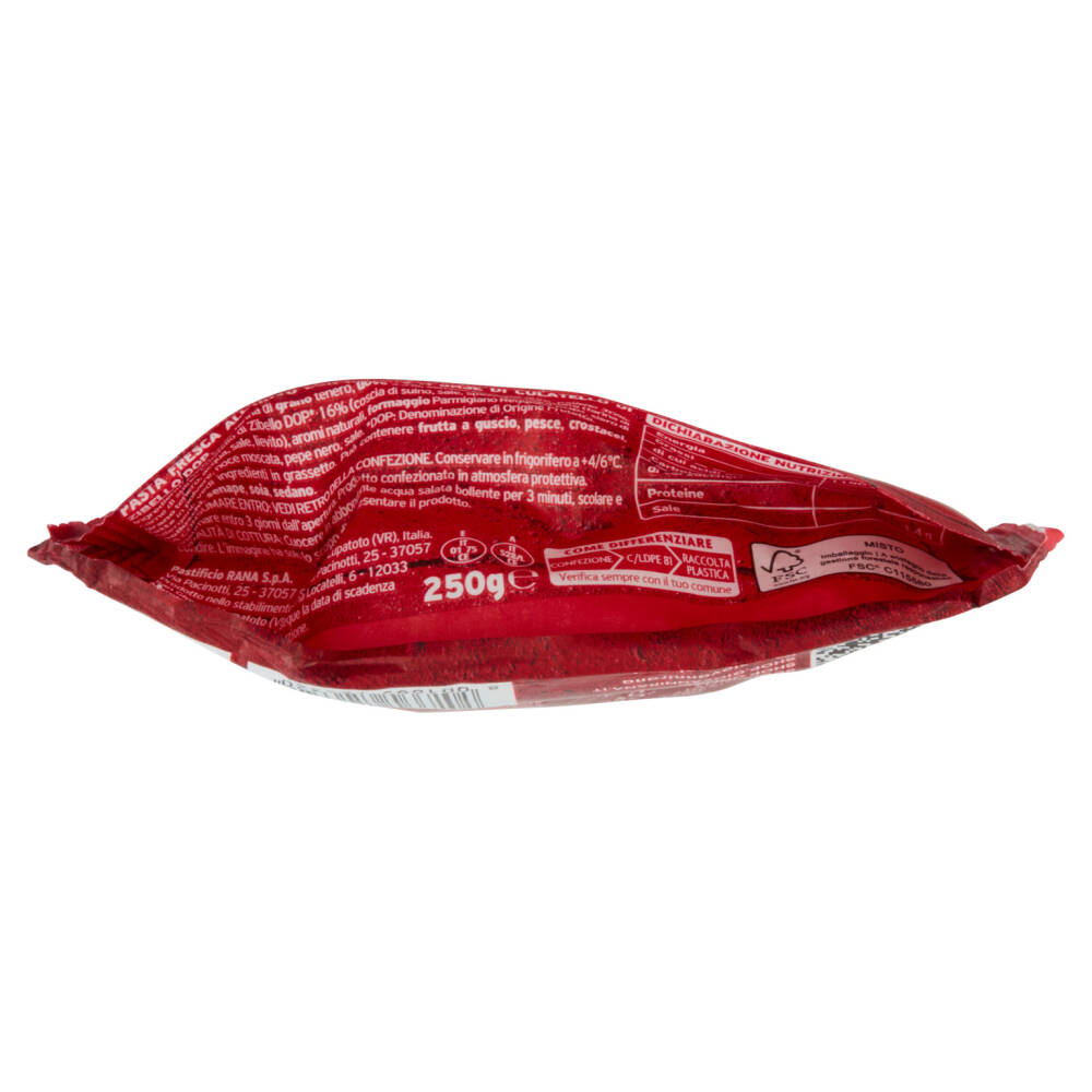 Ripieno 30%: carme di suino, Culatello di Zibello DOP* 16% (coscia di suino, sale, spezie), pangrattato (farina di grano tenero, acqua, sale, lievito), aromi naturali, formaggio Parmigiano Reggiano DOP*, siero di latte in polvere, noce moscata, pepe nero, sale