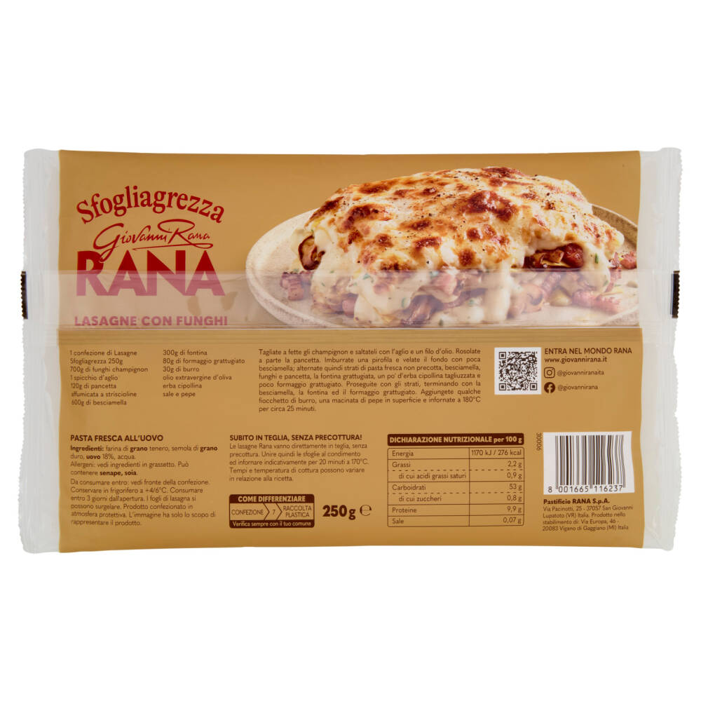 Le lasagne Rana vanno direttamente in teglia, senza precottura. Unire quindi le sfoglie al condimento ed infornare indicativamente per 20 minuti a 170°C. Tempi e temperatura di cottura possono variare in relazione alla ricetta.