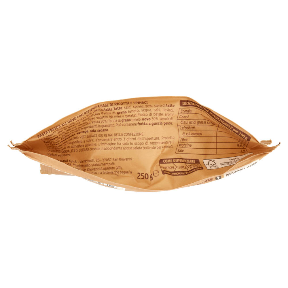 Ripieno 50%: ricotta 39% (siero di latte, latte, sale), spinaci 20%, siero di latte in polvere, olio di girasole, pangrattato (farina di grano tenero, acqua, sale, lievito), formaggio mascarpone, amidi, fibre vegetali (di mais e patata), fiocco di patate, aromi naturali, sale, aglio, noce moscata