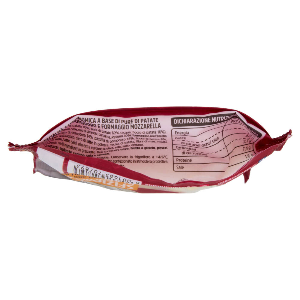 Ripieno 30%: formaggio mozzarella 30%, concentrato di pomodoro 14%, passata di pomodoro 14%, fiocco di patate 8%, formaggio grattugiato, siero di latte in polvere, fecola di patata, fibra di mais, ricotta (siero di latte, latte, sale), olio extra vergine di oliva, sale, aglio, origano