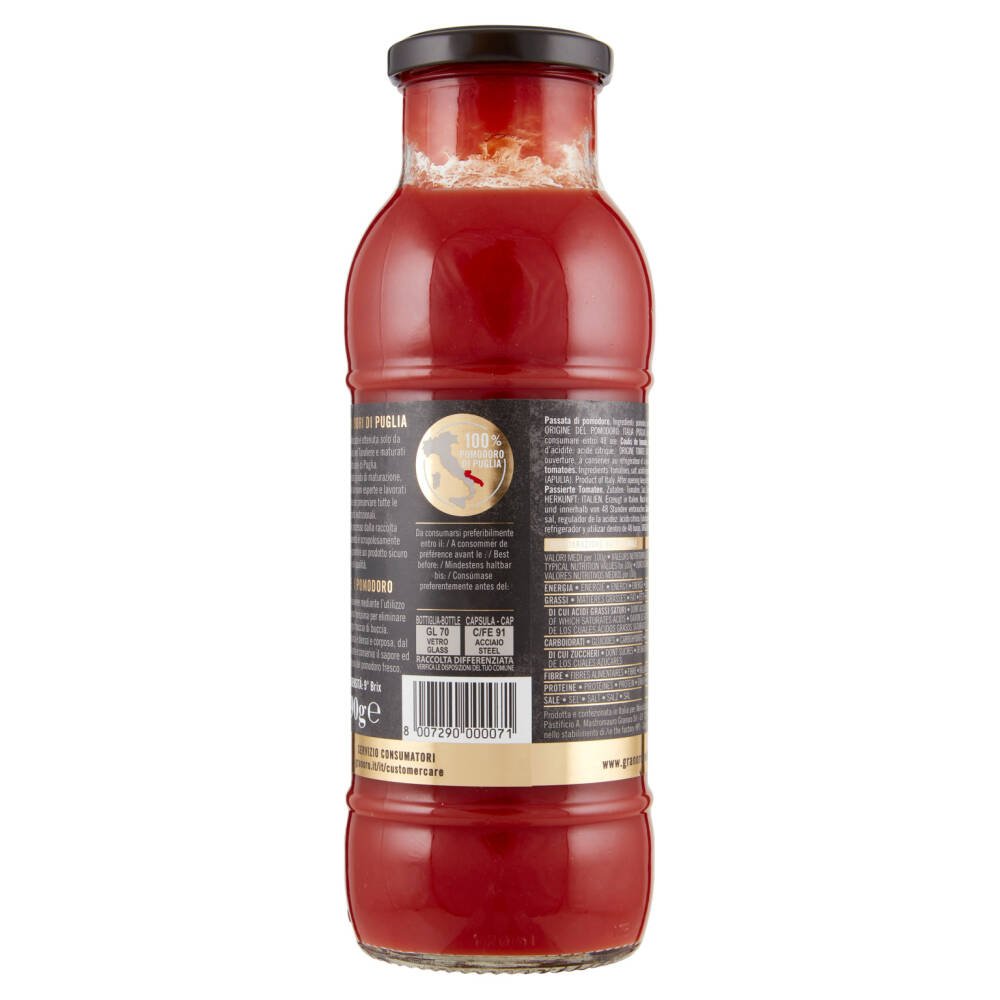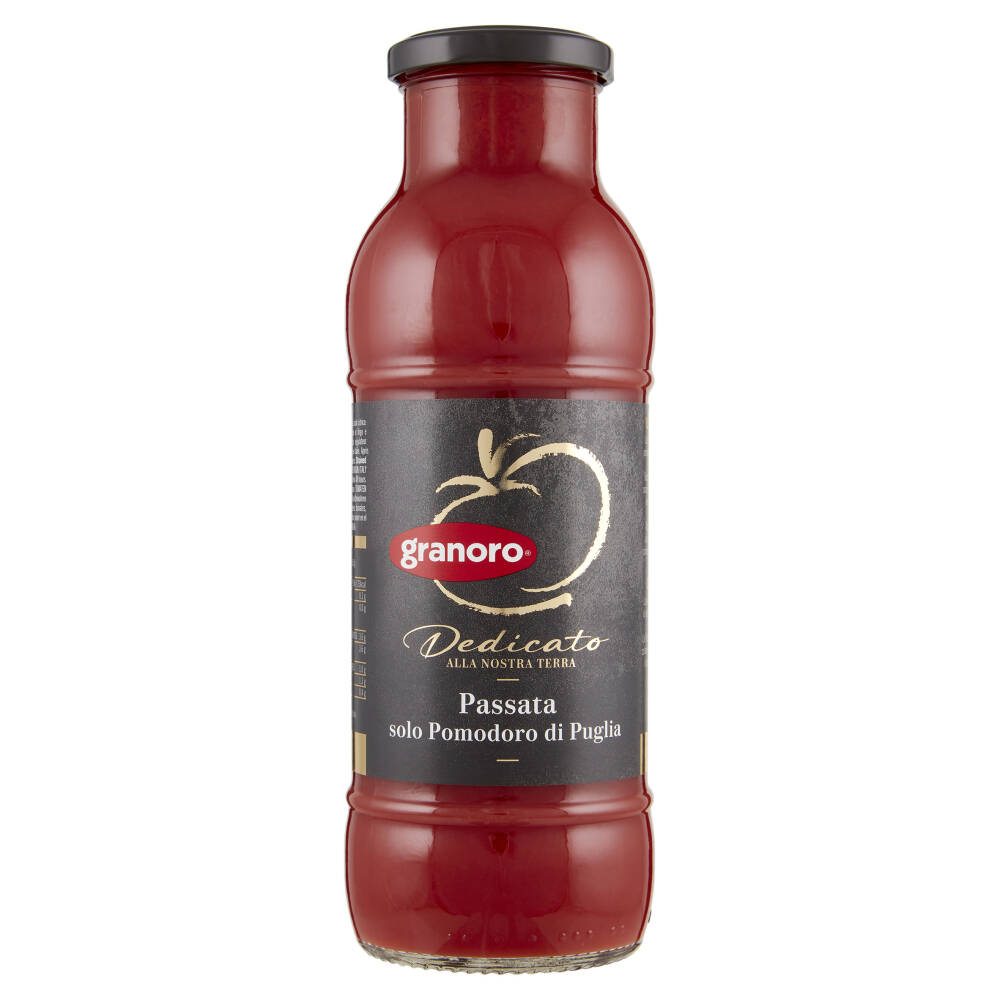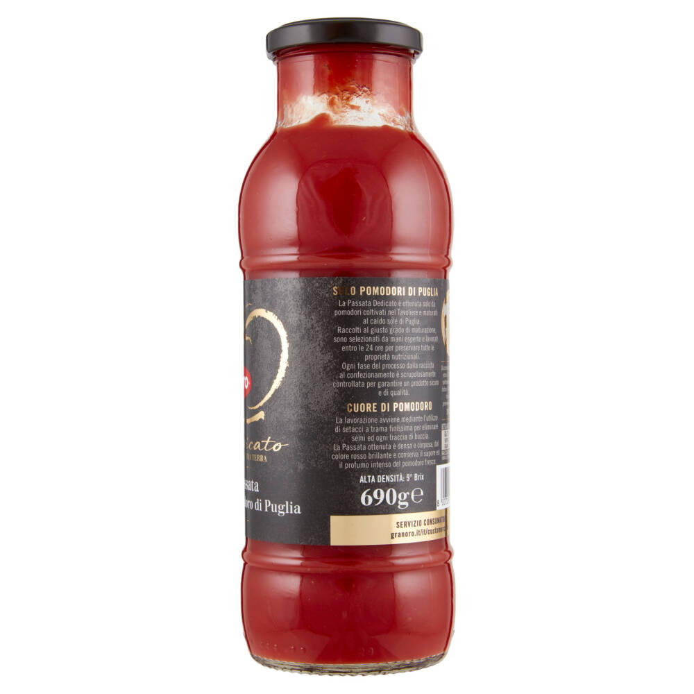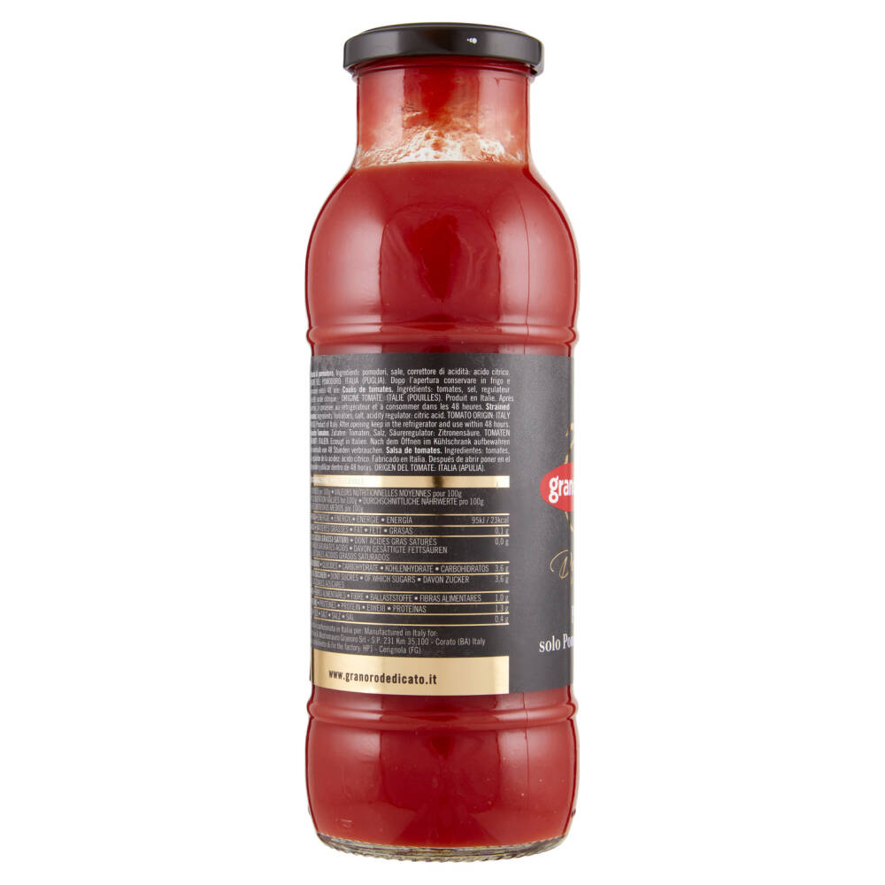 La Passata Dedicato è ottenuta solo da pomodori coltivati nel Tavoliere e maturati al caldo sole di Puglia.