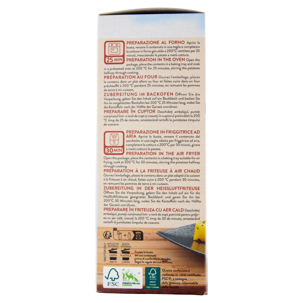 Aprire la busta, versare il contenuto in una teglia e completare la cottura in forno già caldo a 200°C ventilato per 25 minuti, mescolando le patate a metà cottura.