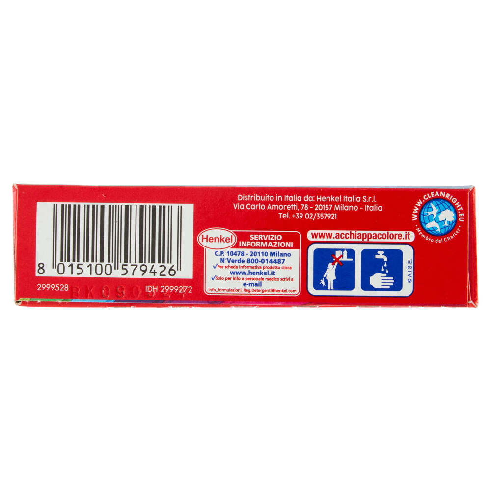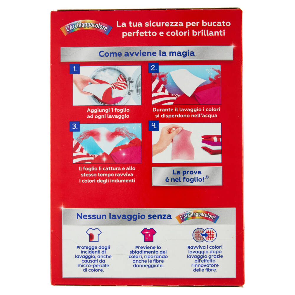 Precauzioni d'uso: I capi scuri e intensamente colorati, il cotone e i tessuti non resistenti al lavaggio sono più suscettibili alle perdite di colore. Per questi capi è raccomandato l'uso di un maggior numero di fogli. Una cura appropriata deve essere usata quando vengono mischiati capi colorati e bianchi. I nuovi capi colorati dovrebbero essere lavati separatamente almeno per i primi sei lavaggi. È comunque consigliato lavare le lenzuola, gli asciugamani e i jeans nuovi separatamente. L'efficacia non può essere garantita in presenza di forti perdite di colore da capi non resistenti al lavaggio. Adatto a tutti i tipi di tessuto, cicli di lavaggio e temperature. Seguire sempre le istruzioni del produttore della lavatrice. L'inserimento del foglio in una reticella salva-bucato è utile a impedirne l'eventuale entrata nel sistema di scarico della lavatrice. Evita di mettere il foglio a contatto con acqua o con capi bagnati prima del lavaggio. Non riutilizzare il foglio dopo il lavaggio.
