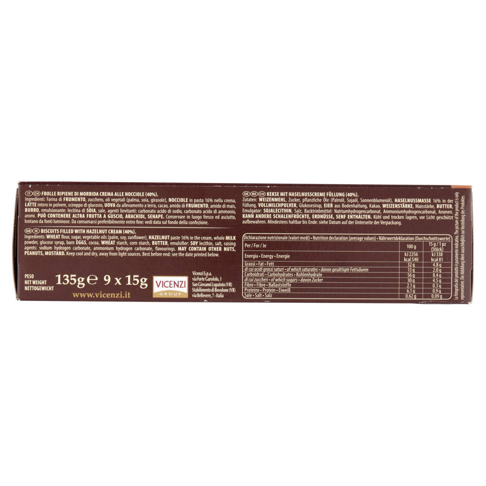 Farina di frumento Zucchero Oli vegetali (palma, soia, girasole) Nocciole in pasta 16% nella crema Latte intero in polvere Sciroppo di glucosio Uova da allevamento a terra Cacao Amido di frumento Amido di mais Burro Emulsionante: lecitina di soia Sale Agenti lievitanti: carbonato acido di sodio, carbonato acido di ammonio Aromi Può contenere altra frutta a guscio, arachidi, senape