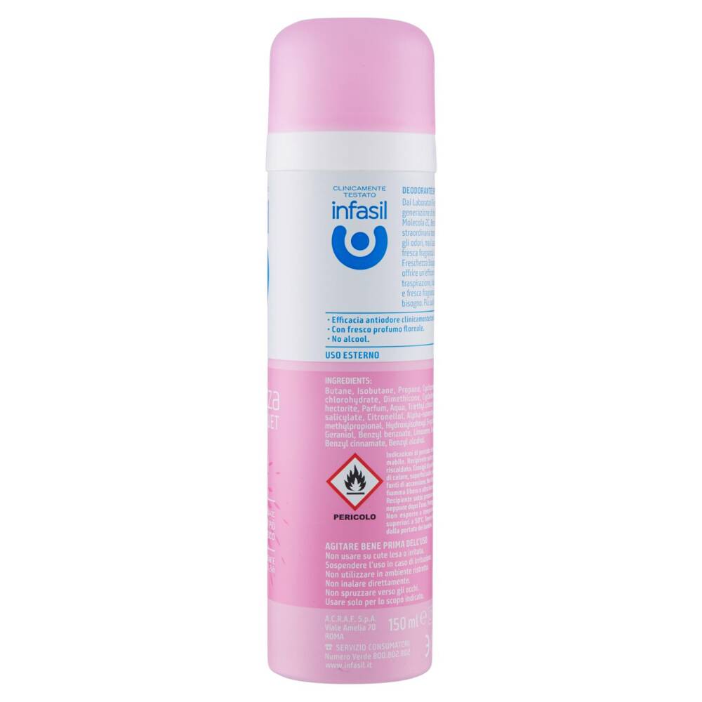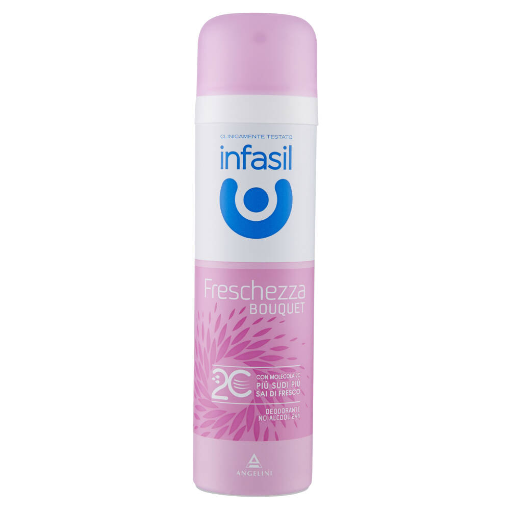 Dai Laboratori Farmaceutici Angelini la generazione di deodoranti con Molecola 2C, Betaciclodestrina, una straordinaria tecnologia che non copre gli odori, ma li assorbe, rilasciando una fresca fragranza. La formula di Infasil Freschezza Bouquet è sviluppata per offrire un'efficace regolazione della traspirazione, rilasciando una delicata e fresca fragranza ogni volta che ne hai bisogno. Più sudi più sai di fresco!
