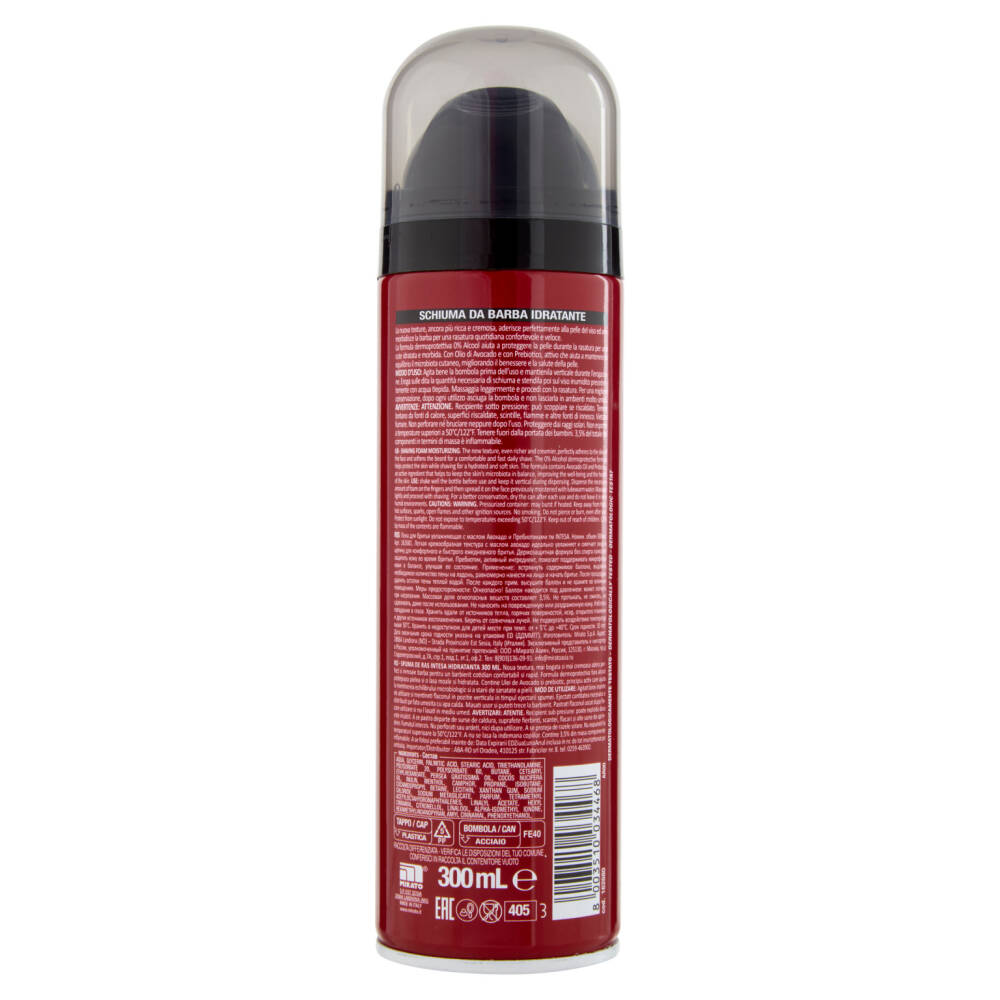 Modo d'uso: Agita bene la bombola prima dell'uso e mantienila verticale durante l'erogazione. Eroga sulle dita la quantità necessaria di schiuma e stendila poi sul viso inumidito precedentemente con acqua tiepida. Massaggia leggermente e procedi con la rasatura. Per una migliore conservazione, dopo ogni utilizzo asciuga la bombola e non lasciarla in ambienti molto umidi.