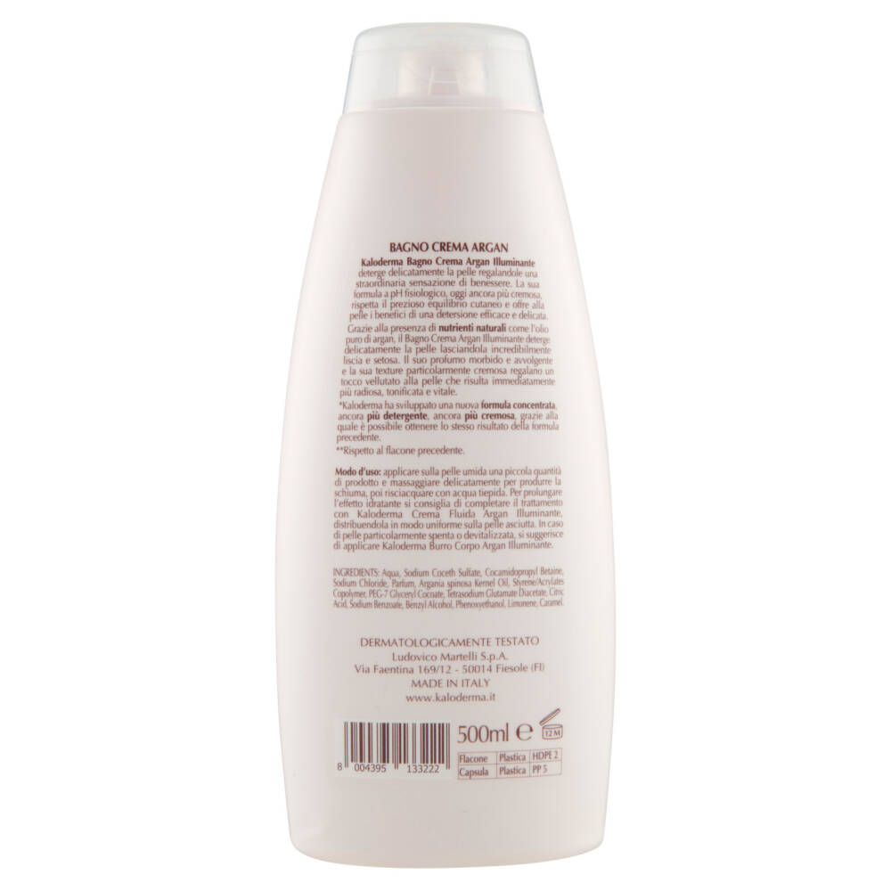 Nuova formula concentrata* - 500ml = 750ml di prodotto Con olio puro di argan Idrata e rigenera la pelle rendendola radiosa e vitale Nuovo flacone - Oltre il 40% di plastica in meno** *Kaloderma ha sviluppato una nuova formula concentrata, ancora più detergente, ancora più cremosa, grazie alla quale è possibile ottenere lo stesso risultato della formula precedente **Rispetto al flacone precedente