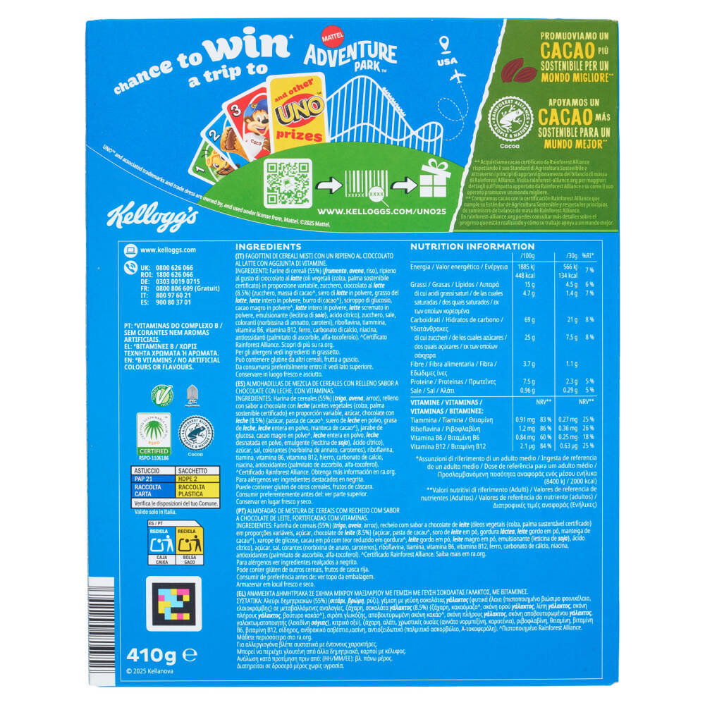 Ripieno al gusto di cioccolato al latte (oli vegetali {colza, palma sostenibile certificato} in proporzione variabile, zucchero, cioccolato al latte (8.5%) (zucchero, massa di cacao^, siero di latte in polvere, grasso del latte, latte intero in polvere, burro di cacao^}, sciroppo di glucosio, cacao magro in polvere^, latte intero in polvere, latte scremato in polvere, emulsionante {lecitina di soia}, acido citrico)
