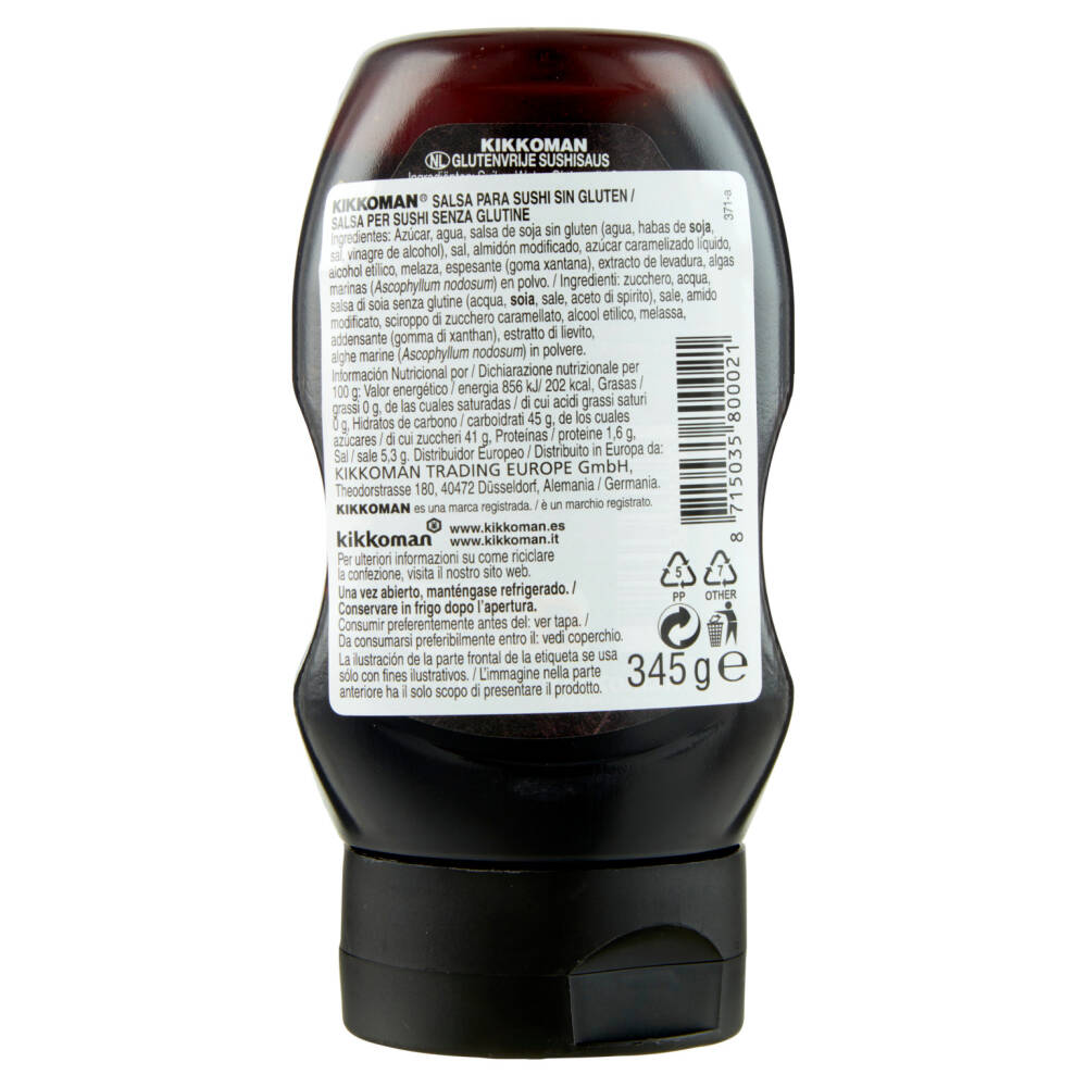 Zucchero Acqua Salsa di soia senza glutine (acqua, soia, sale, aceto di spirito) Sale Amido modificato Sciroppo di zucchero caramellato Alcool etilico Melassa Addensante (gomma di xanthan) Estratto di lievito Alghe marine (Ascophyllum nodosum) in polvere