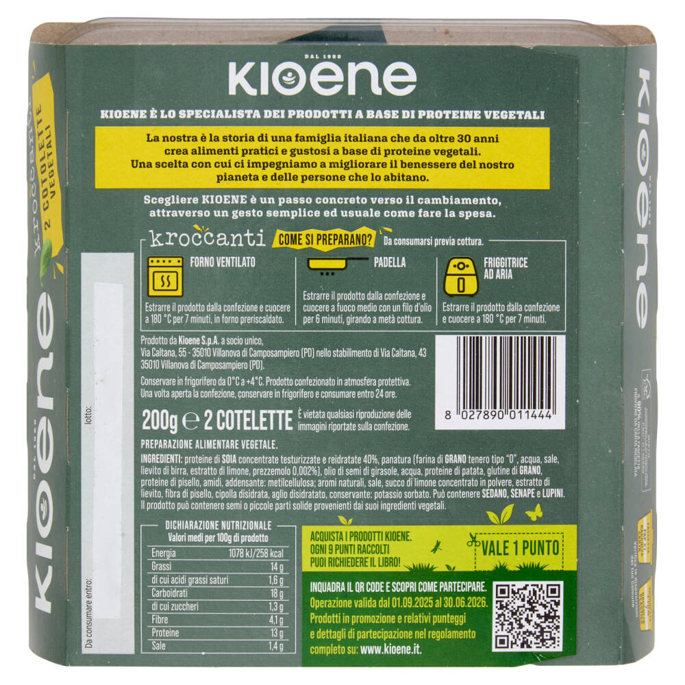 Proteine di soia concentrate testurizzate e reidratate 40% Panatura (farina di grano tenero tipo "0", acqua, sale, lievito di birra, estratto di limone, prezzemolo 0,002%) Olio di semi di girasole Acqua Proteine di patata Glutine di grano Proteine di pisello Amidi Addensante: metilcellulosa Aromi naturali Sale Succo di limone concentrato in polvere Estratto di lievito Fibra di pisello Cipolla disidratata Aglio disidratato Conservante: potassio sorbato Può contenere sedano, senape e lupini Il prodotto può contenere semi o piccole parti solide provenienti dai suoi ingredienti vegetali