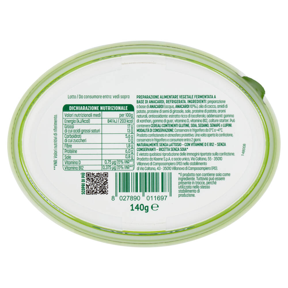 Preparazione a base di anacardi (acqua, anacardi 10%) Olio di cocco Amidi di patate Proteine di semi di girasole Sale Proteine di patate Aromi naturali Antiossidante: estratto ricco di tocoferolo Addensanti: gomma di xanthan, gomma di guar Vitamina D Vitamina B12 Colture starter Può contenere: cereali contenenti glutine, soia, sedano, senape e lupini