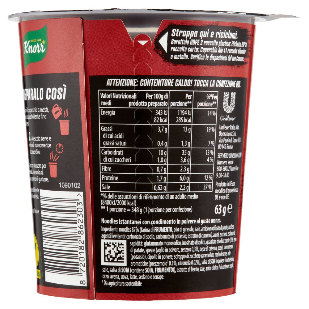 Noodles 87% (farina di frumento, olio di girasole, sale, amido modificato di patate, zucchero, agenti lievitanti: carbonato di sodio, carbonato di potassio; estratto di curcuma)