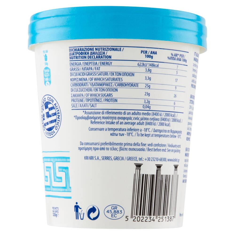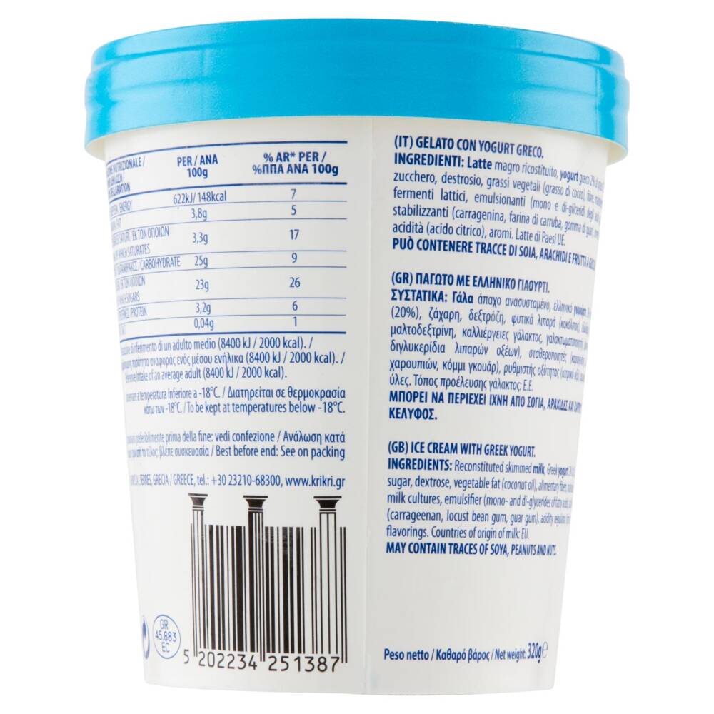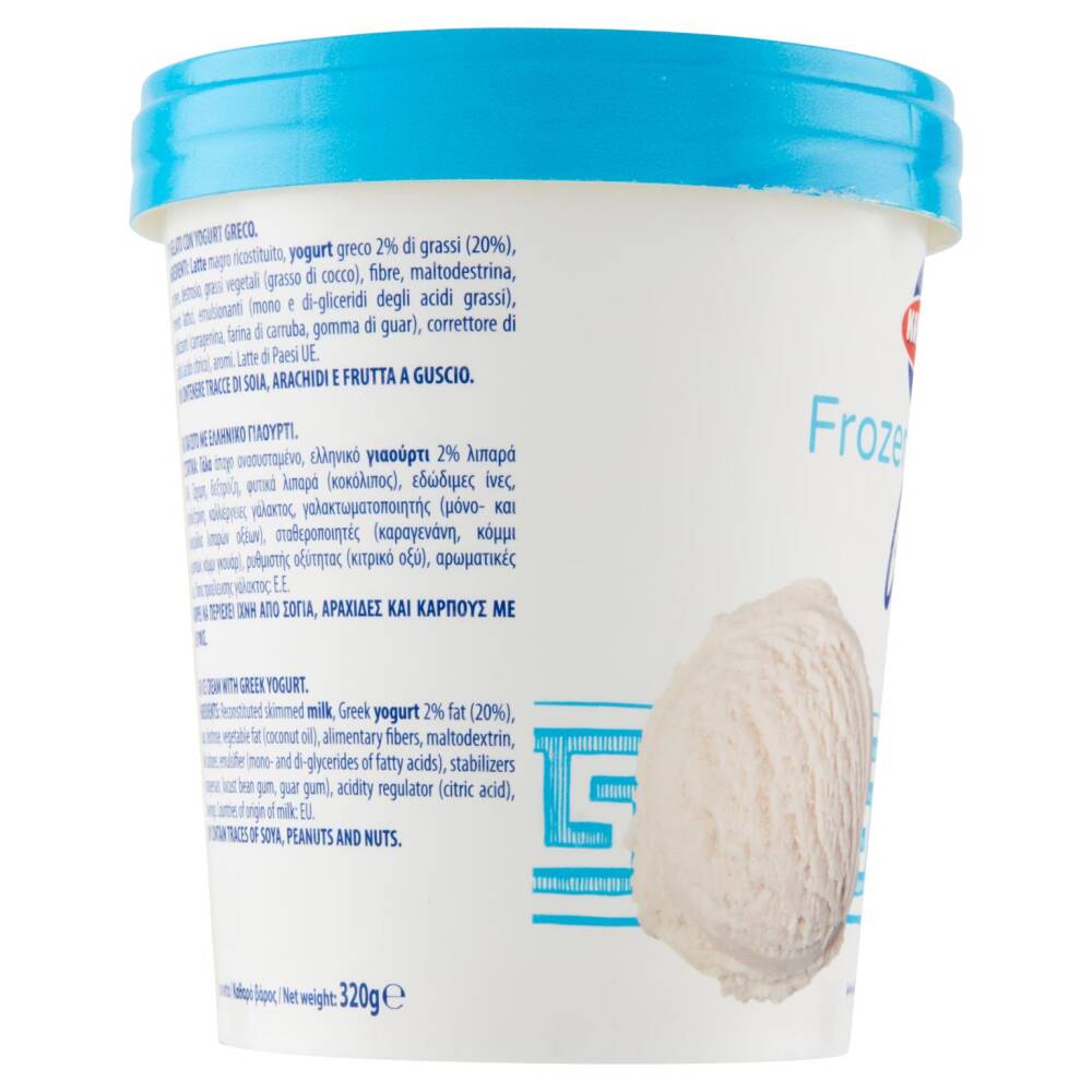 Latte magro ricostituito Yogurt greco 2% di grassi (20%) Zucchero Destrosio Grassi vegetali (grasso di cocco) Fibre Maltodestrina Fermenti lattici Emulsionanti (mono e di-gliceridi degli acidi grassi) Stabilizzanti (carragenina, farina di carruba, gomma di guar) Correttore di acidità (acido citrico) Aromi PUÒ CONTENERE TRACCE DI SOIA, ARACHIDI E FRUTTA A GUSCIO
