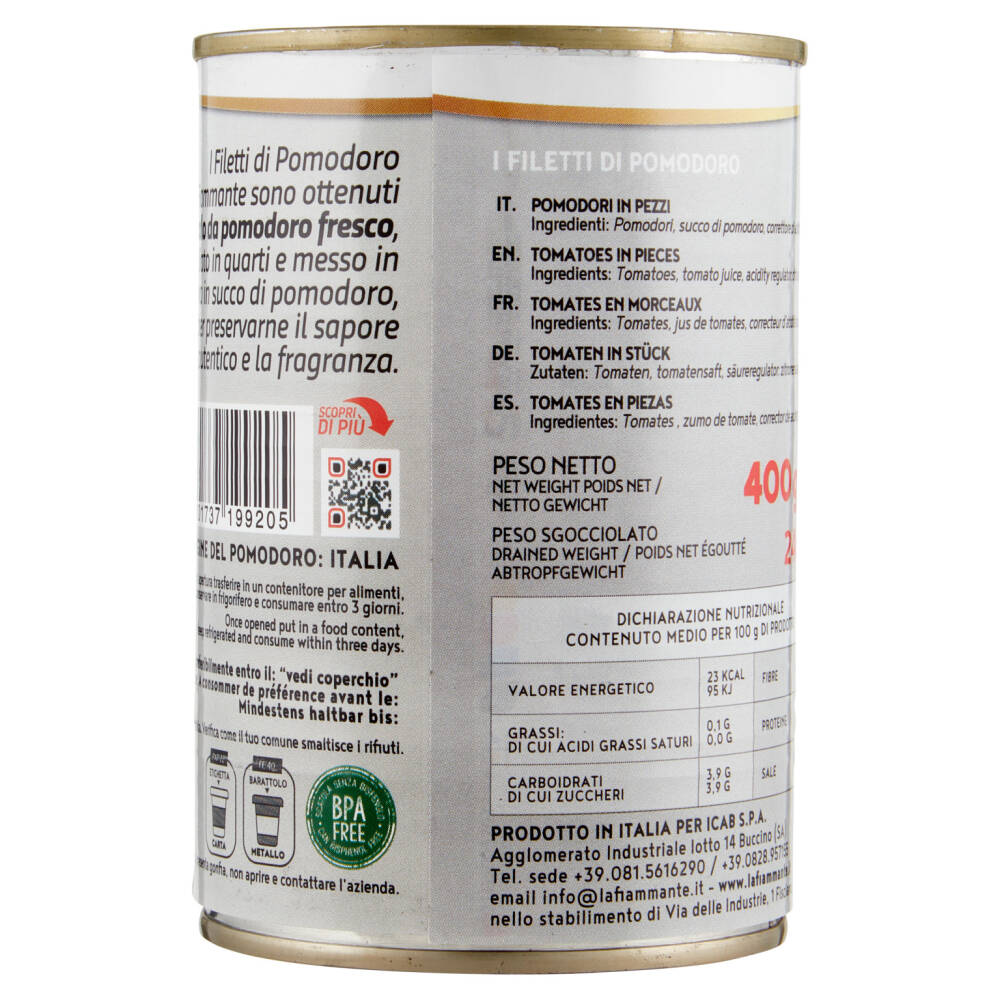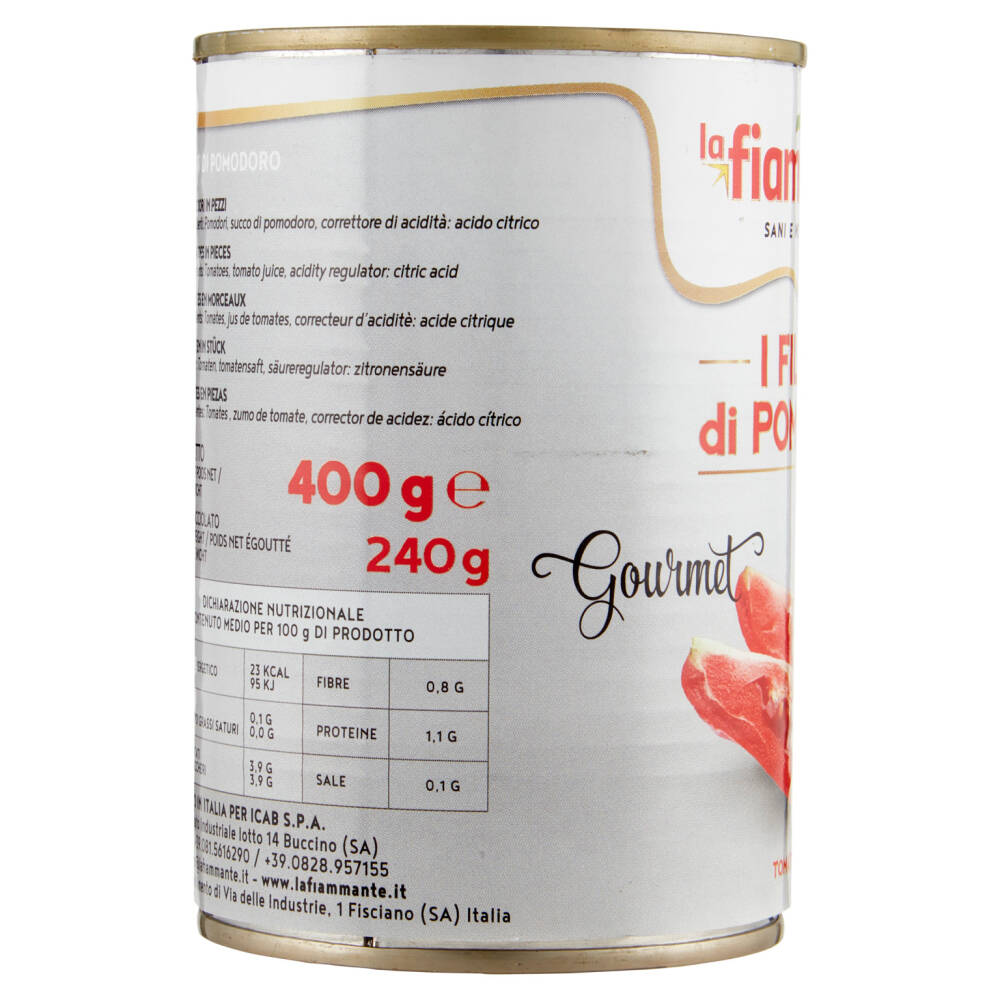 I Filetti di Pomodoro La Fiammante sono ottenuti solo da pomodoro fresco, tagliato in quarti e messo in conserva in succo di pomodoro, per preservarne il sapore autentico e la fragranza.