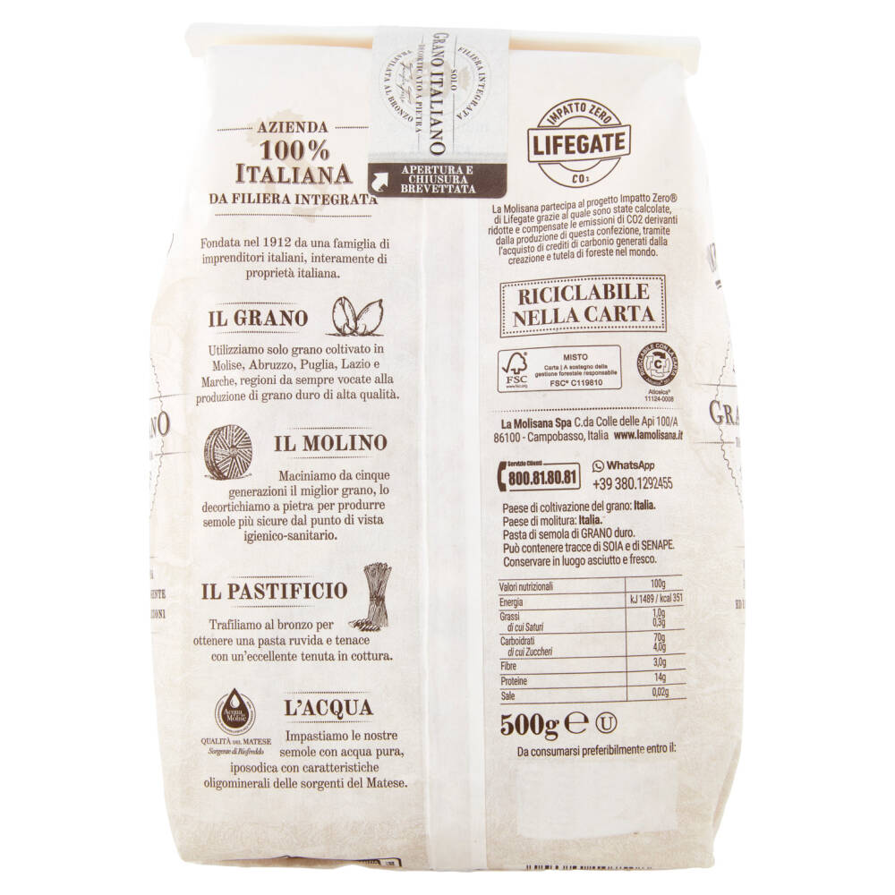 La Molisana partecipa al progetto Impatto Zero di LifeGate grazie al quale sono state calcolate, ridotte e compensate le emissioni di CO2 derivanti dalla produzione di questa confezione, tramite l'acquisto di crediti di carbonio generati dalla creazione e tutela di foreste nel mondo.