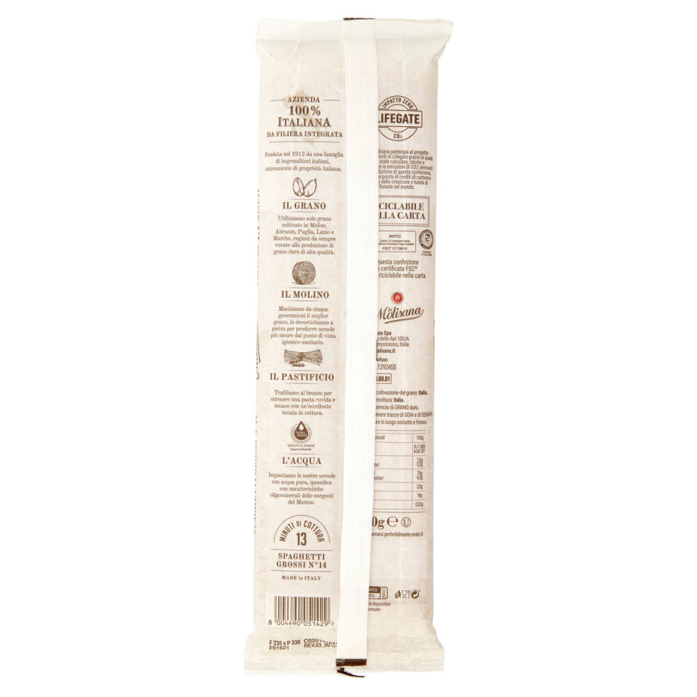 La Molisana partecipa al progetto Impatto Zero di Lifegate grazie al quale sono state calcolate, ridotte e compensate le emissioni di CO2 derivanti dalla produzione di questa confezione, tramite l'acquisto di crediti di carbonio generati dalla creazione e tutela di foreste nel mondo.