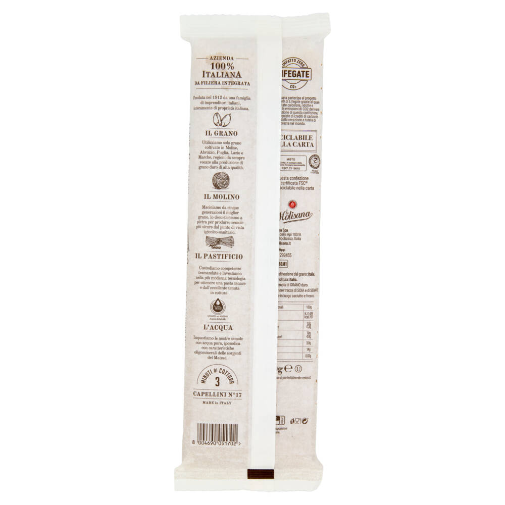 La Molisana partecipa al progetto Impatto Zero di Lifegate grazie al quale sono state calcolate, ridotte e compensate le emissioni di CO2 derivanti dalla produzione di questa confezione, tramite l'acquisto di crediti di carbonio generati dalla creazione e tutela di foreste nel mondo.