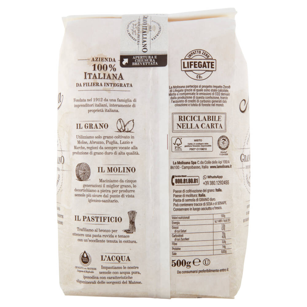 La Molisana partecipa al progetto Impatto Zero di Lifegate grazie al quale sono state calcolate, ridotte e compensate le emissioni di CO2 derivanti dalla produzione di questa confezione, tramite l'acquisto di crediti di carbonio generati dalla creazione e tutela di foreste nel mondo.