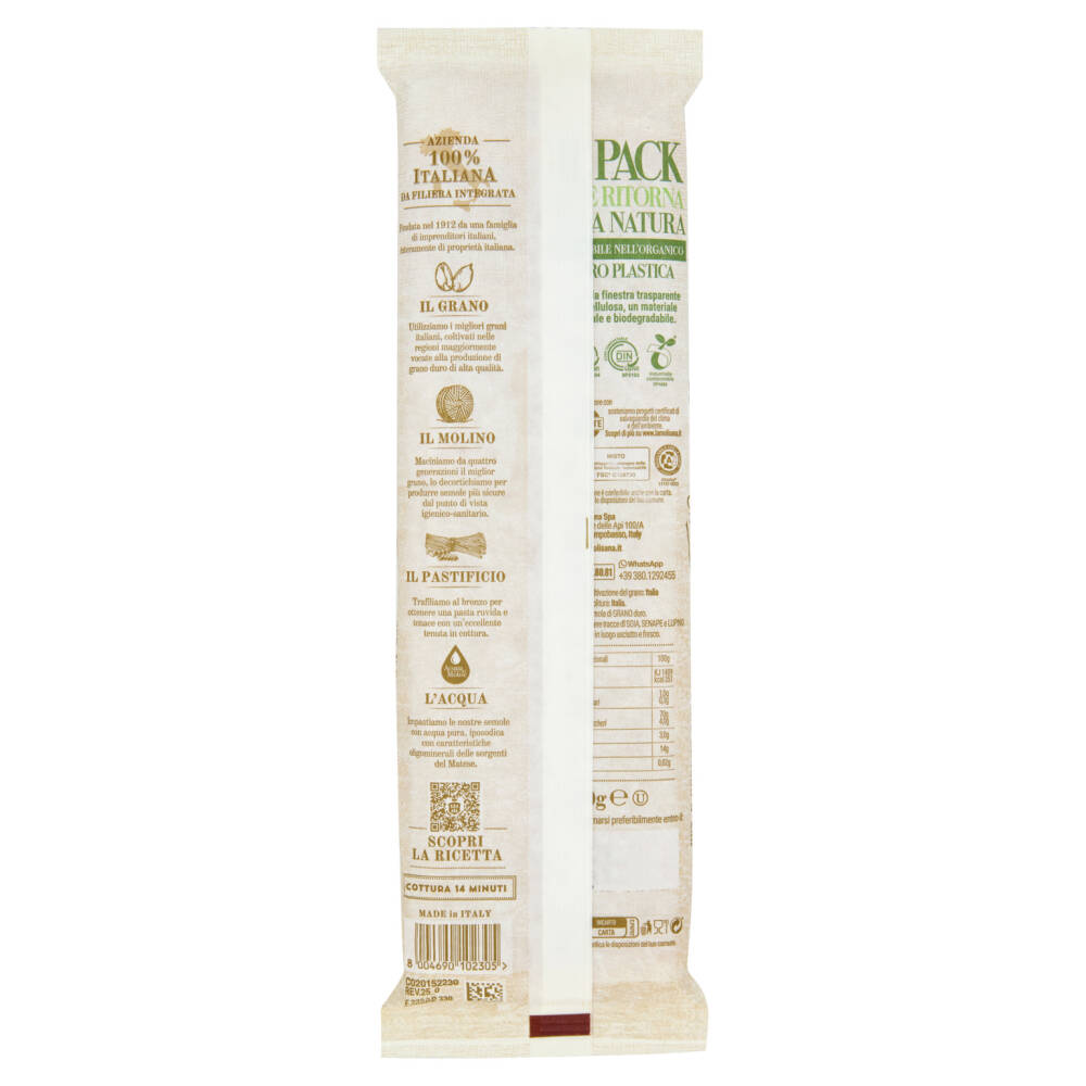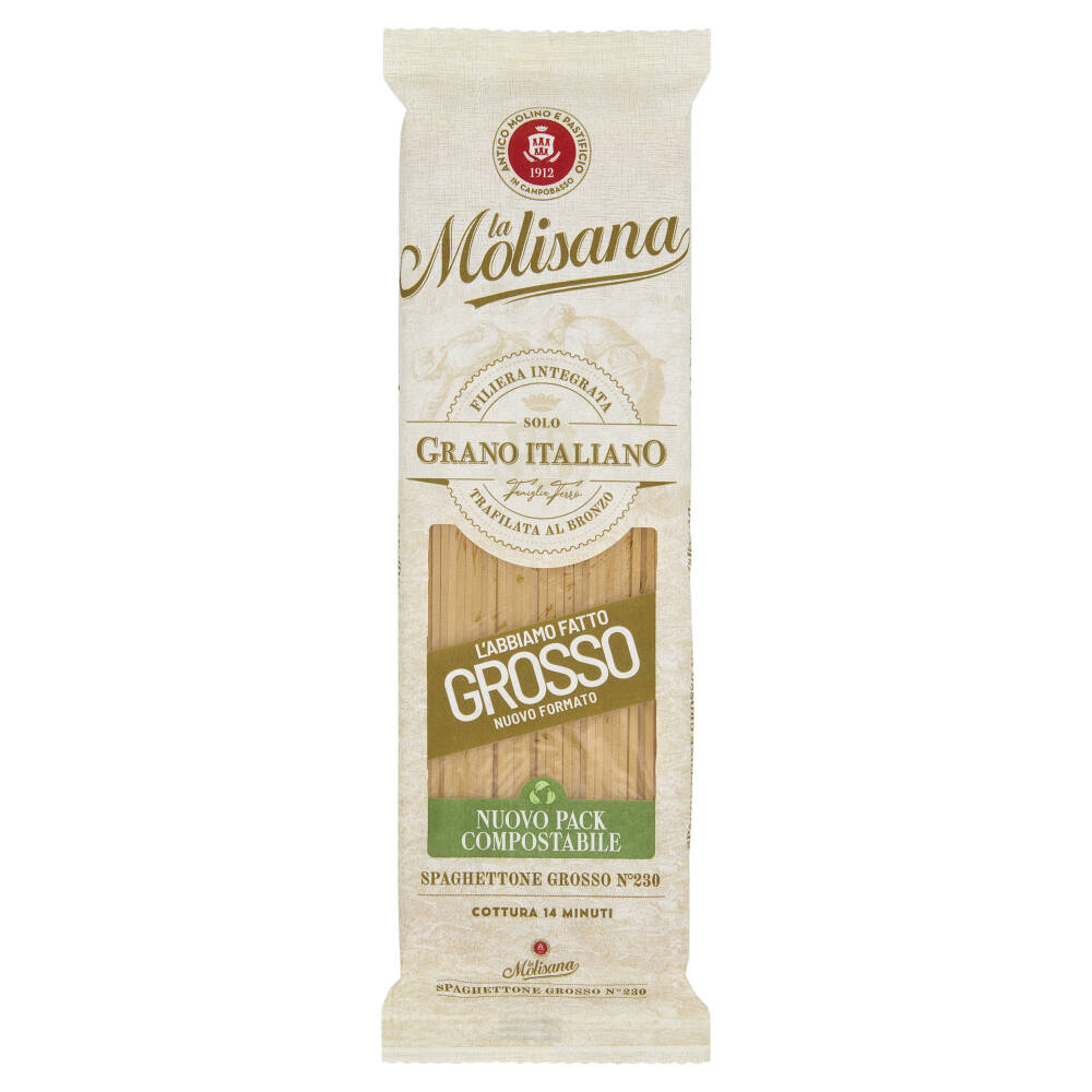 Filiera integrata Solo grano italiano Trafilata al bronzo L'abbiamo fatto grosso - Nuovo formato Nuovo pack compostabile Cottura 14 minuti