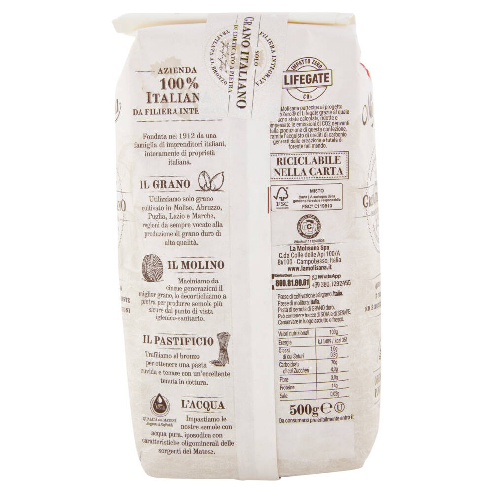 La Molisana partecipa al progetto Impatto Zero di Lifegate grazie al quale sono state calcolate, ridotte e compensate le emissioni di CO2 derivanti dalla produzione di questa confezione, tramite l'acquisto di crediti di carbonio generati dalla creazione e tutela di foreste nel mondo.