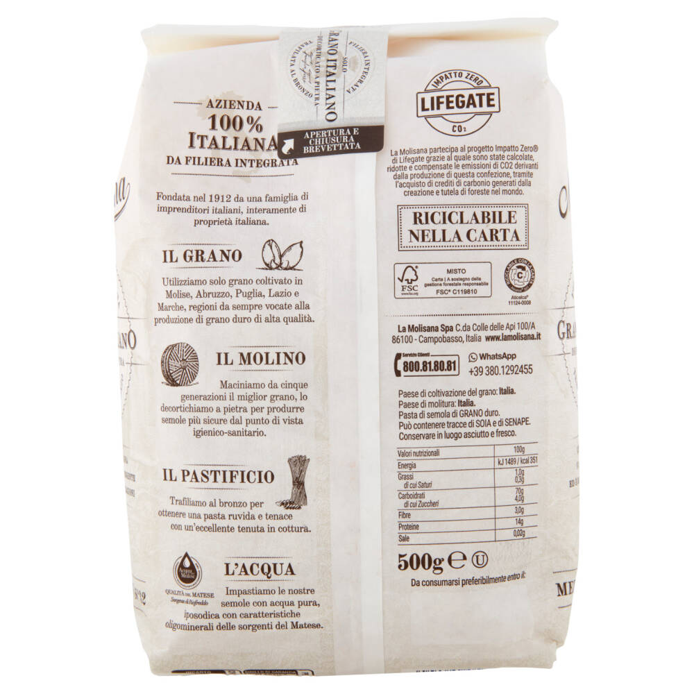 La Molisana partecipa al progetto Impatto Zero di Lifegate grazie al quale sono state calcolate, ridotte e compensate le emissioni di CO2 derivanti dalla produzione di questa confezione, tramite l'acquisto di crediti di carbonio generati dalla creazione e tutela di foreste nel mondo.