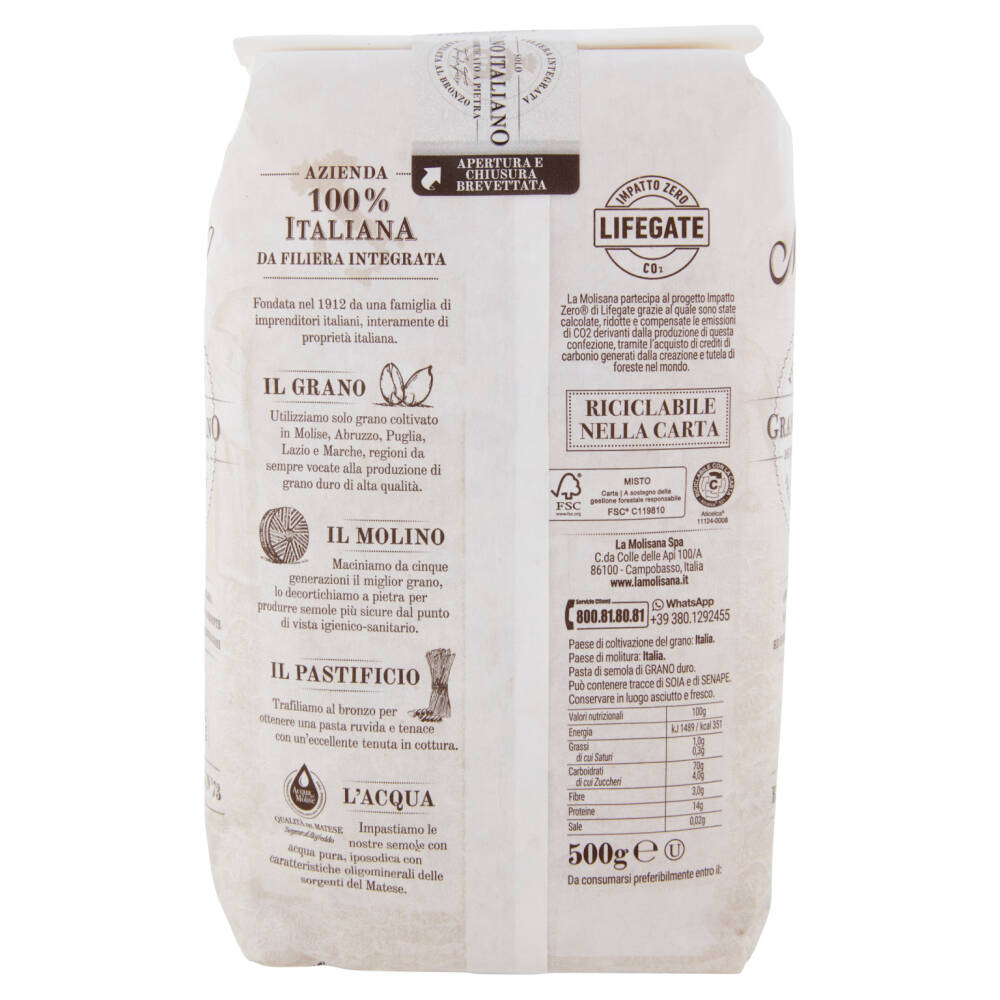 La Molisana partecipa al progetto Impatto Zero di Lifegate grazie al quale sono state calcolate, ridotte e compensate le emissioni di CO2 derivanti dalla produzione di questa confezione, tramite l'acquisto di crediti di carbonio generati dalla creazione e tutela di foreste nel mondo.