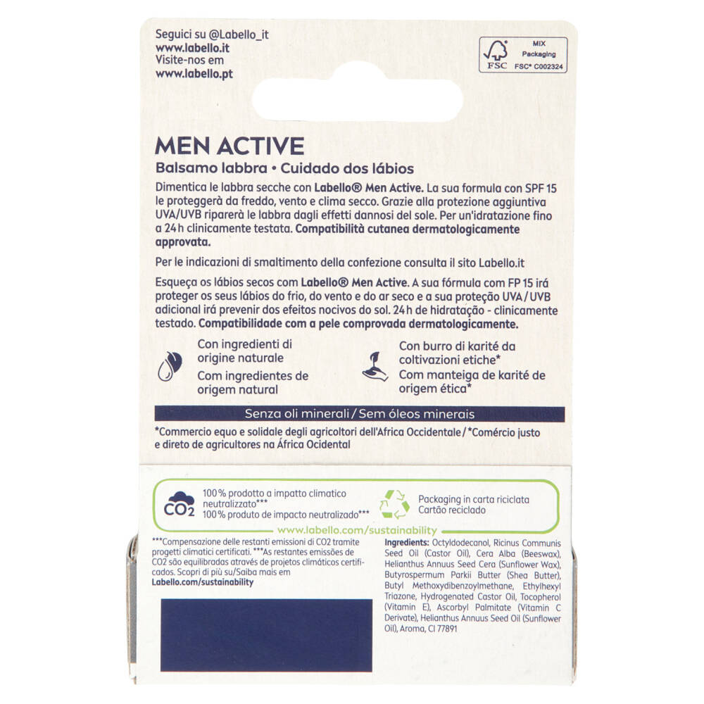 Dimentica le labbra secche con Labello Men Active. La sua formula con SPF 15 le proteggerà da freddo, vento e clima secco. Grazie alla protezione aggiuntiva UVA/UVB riparerà le labbra dagli effetti dannosi del sole. Per un'idratazione fino a 24h clinicamente testata. Compatibilità cutanea dermatologicamente approvata.