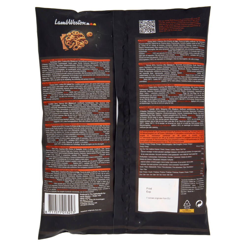 Patate (84%) Copertura (9%) [farina di frumento, amido di patate modificato, sale, spezie (peperoncino, paprica, pepe di cesenna, pepe nero, cumino, curcuma), amido di mais, aglio in polvere, cipolla in polvere, estratto di lievito, agenti lievitanti (difosfato disodico), destrosio, spezie estratto (paprica, pepe nero)] Oli vegetali (colza, girasole, in proporzione variabile) (7%) Destrosio