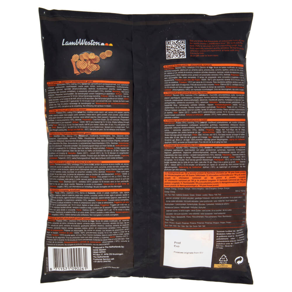 Patate (79%) Copertura (11%) [farina di frumento, amido di patate modificato, sale, spezie (peperoncino, paprica, pepe di cesenna, pepe nero, cumino, curcuma), amido di mais, aglio in polvere, cipolla in polvere, estratto di lievito, agenti lievitanti (difosfato disodico), destrosio, spezie estratto (paprica, pepe nero)] Oli vegetali (colza, girasole, in proporzione variabile) (10%) Destrosio