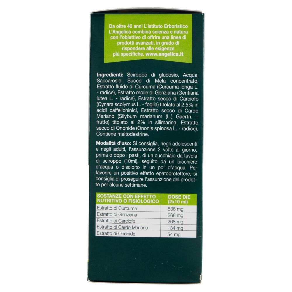 Sciroppo di glucosio Acqua Saccarosio Succo di Mela concentrato Estratto fluido di Curcuma (Curcuma longa L. - radice) Estratto molle di Genziana (Gentiana lutea L. - radice) Estratto secco di Carciofo (Cynara scolymus L. - foglia) titolato al 2,5% in acidi caffeilchinici Estratto secco di Cardo Mariano (Silybum marianum (L.) Gaertn. - frutto) titolato al 2% in silimarina Estratto secco di Ononide (Ononis spinosa L. - radice) Contiene maltodestrine