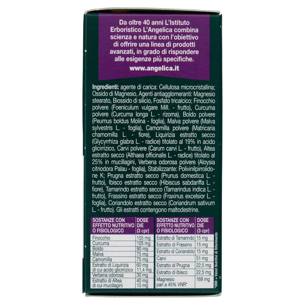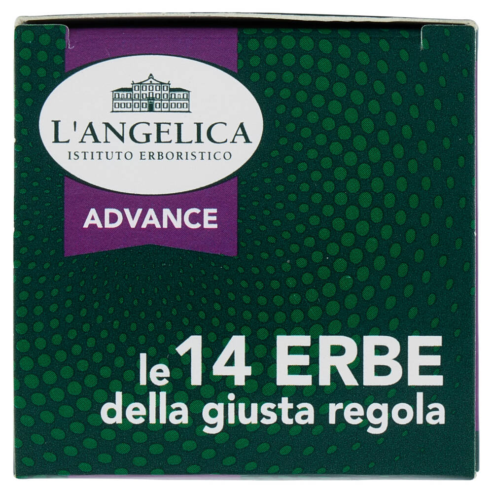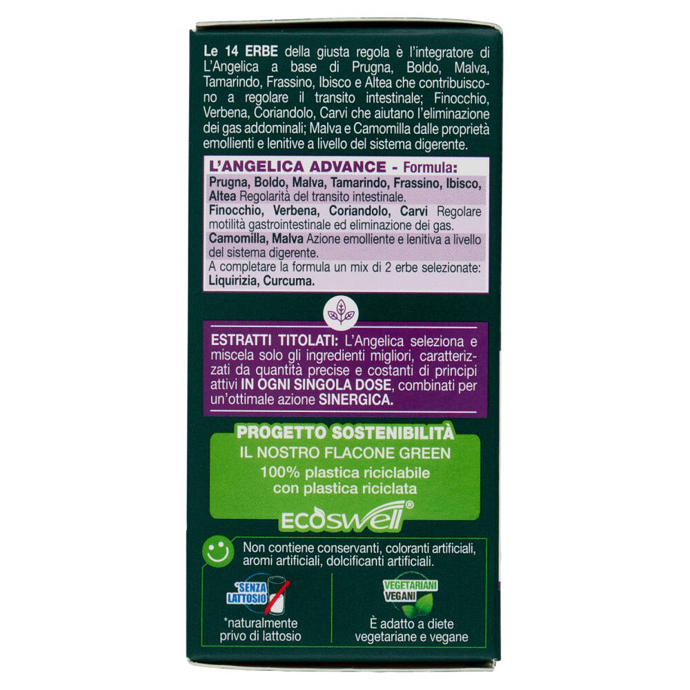 Le 14 Erbe della giusta regola è l'integratore di L'Angelica a base di Prugna, Boldo, Malva, Tamarindo, Frassino, Ibisco e Altea che contribuiscono a regolare il transito intestinale; Finocchio, Verbena, Coriandolo, Carvi che aiutano l'eliminazione dei gas addominali; Malva e Camomilla dalle proprietà emollienti e lenitive a livello del sistema digerente.