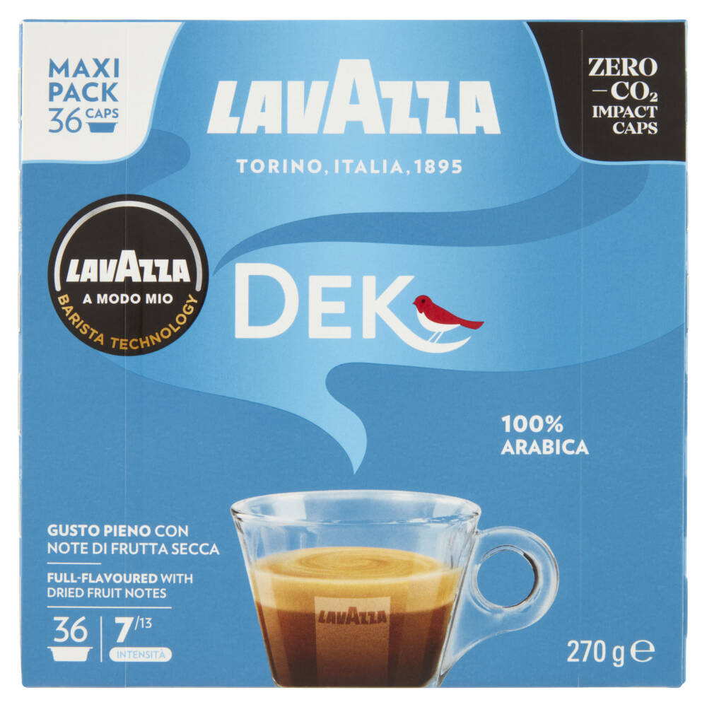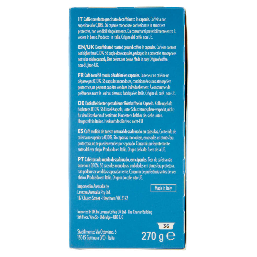 Caffè torrefatto macinato decaffeinato in capsule. Caffeina non superiore allo 0,10%. 36 capsule monodose, confezionate in atmosfera protettiva, non vendibili singolarmente