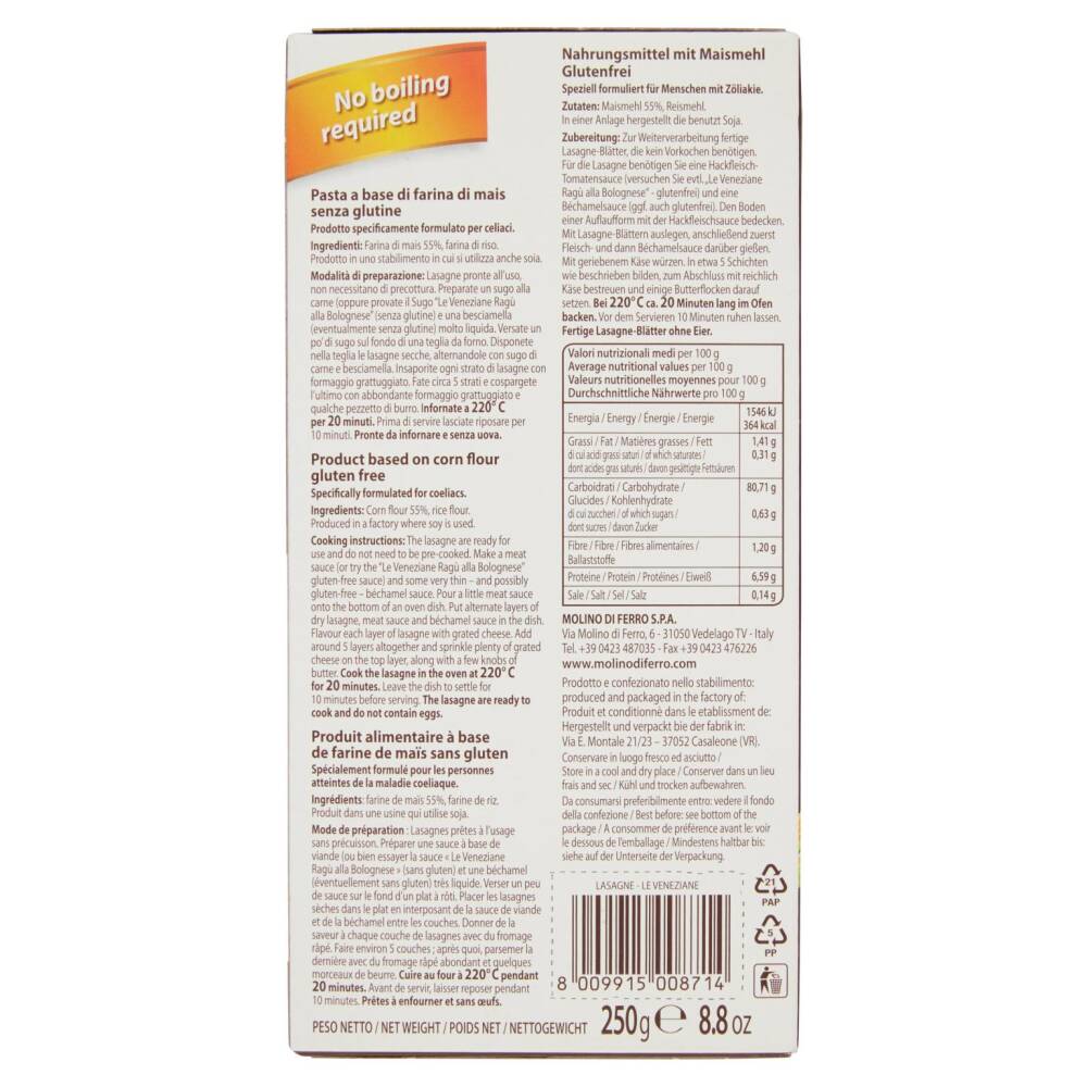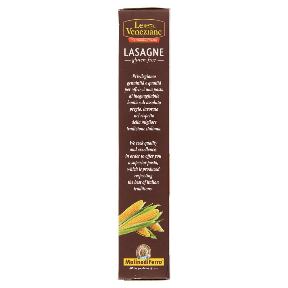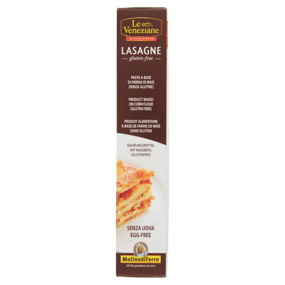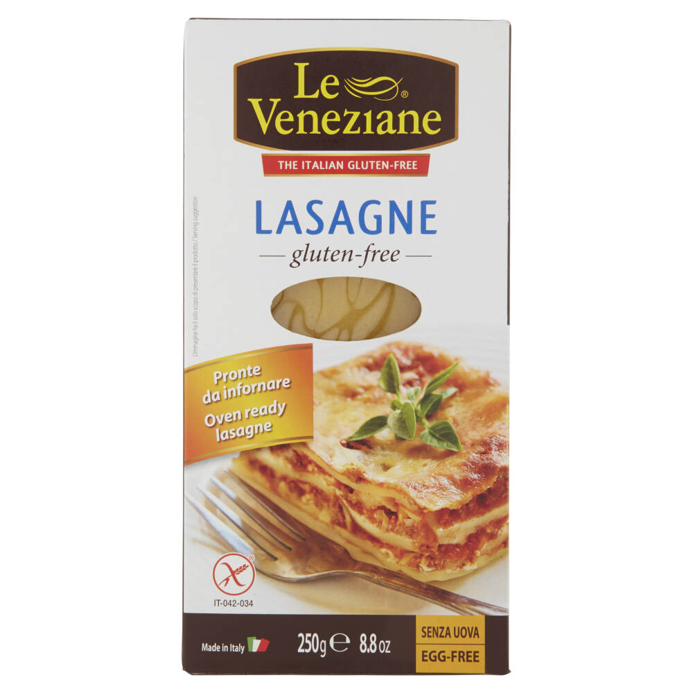 Modalità di preparazione: Lasagne pronte all'uso, non necessitano di precottura, Preparate un sugo alla carne (oppure provate il Sugo "Le Veneziane Ragù alla Bolognese" (senza glutine) e una besciamella (eventualmente senza glutine) molto liquida. Versate un po' di sugo sul fondo di una teglia da forno. Disponete nella teglia le lasagne secche, alternandole con sugo di carne e besciamella. Insaporite ogni strato di lasagne con formaggio grattuggiato. Fate circa 5 strati e cospargete l'ultimo con abbondante formaggio grattuggiato e qualche pezzetto di burro. Infornate a 220°C per 20 minuti. Prima di servire lasciate riposare per 10 minuti. Pronte da infornare e senza uova.