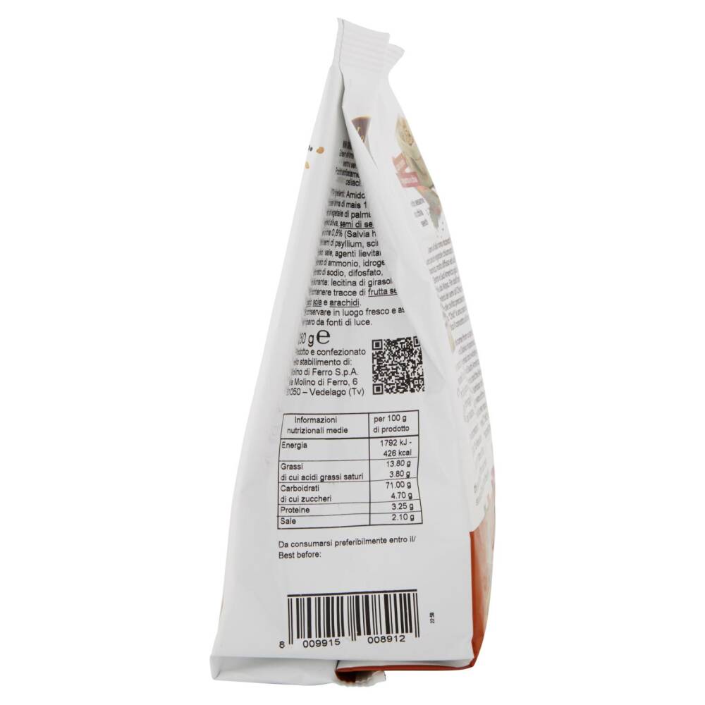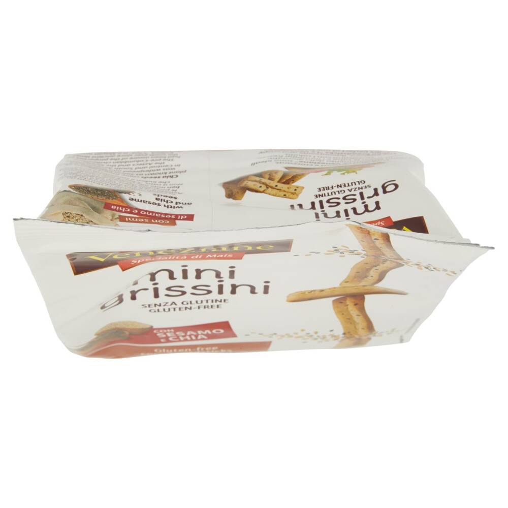 Amido di mais Fecola di patate Farina di mais 12,4% Farina di riso Olio vegetale di palma Olio extra vergine di oliva Semi di sesamo 3,7% Semi di chia 0,8% (Salvia hispanica) Fibra di semi di psyllium Sciroppo di glucosio Sale Agenti lievitanti: carbonato di ammonio, idrogeno carbonato di sodio, difosfato Emulsionante: lecitina di soia Aroma naturale Può contenere tracce di frutta secca a guscio, arachidi