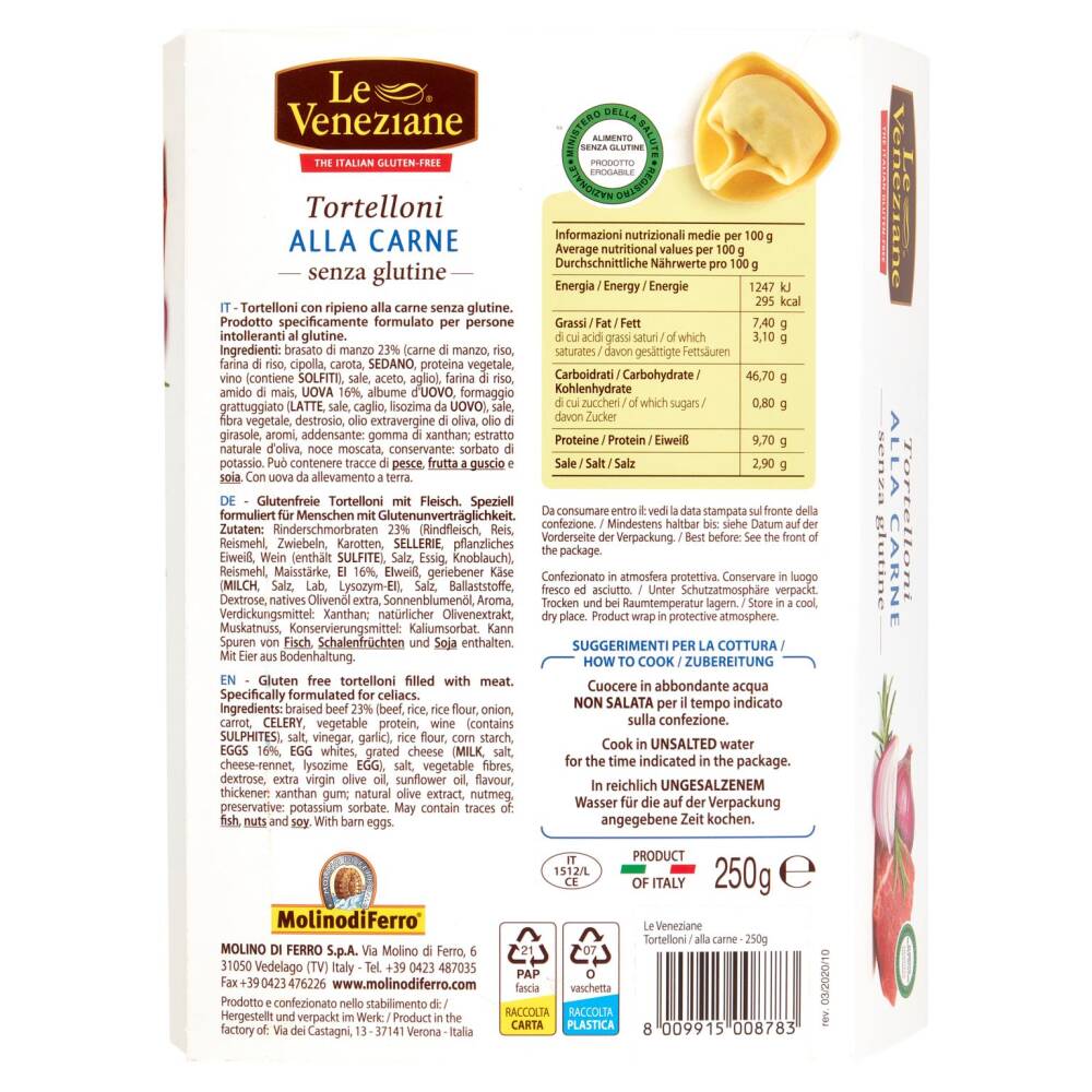 Brasato di manzo 23% (carne di manzo, riso, farina di riso, cipolla, carota, SEDANO, proteina vegetale, vino (contiene SOLFITI), sale, aceto, aglio) Farina di riso Amido di mais UOVA 16% Albume d'UOVO Formaggio grattuggiato (LATTE, sale, caglio, lisozima da UOVO) Sale Fibra vegetale Destrosio Olio extravergine di oliva Olio di girasole Aromi Addensante: gomma di xanthan Estratto naturale d'oliva Noce moscata Conservante: sorbato di potassio Può contenere tracce di pesce, frutta a guscio e soia Con uova da allevamento a terra