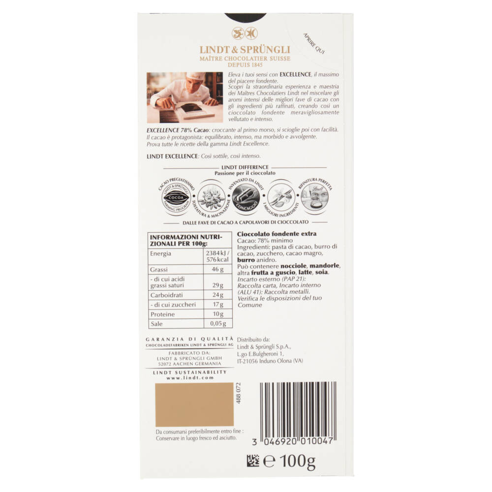 Excellence 78% Cacao: croccante al primo morso, si scioglie poi con facilità. Il cacao è protagonista: equilibrato, intenso, ma morbido e avvolgente.