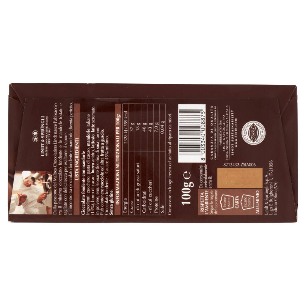 Dalla passione dei Maîtres Chocolatiers Lindt nasce l'abbraccio tra il finissimo cioccolato fondente e le mandorle tostate e tagliate con delicatezza per esaltarne il sapore.