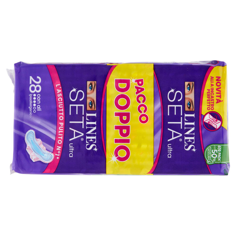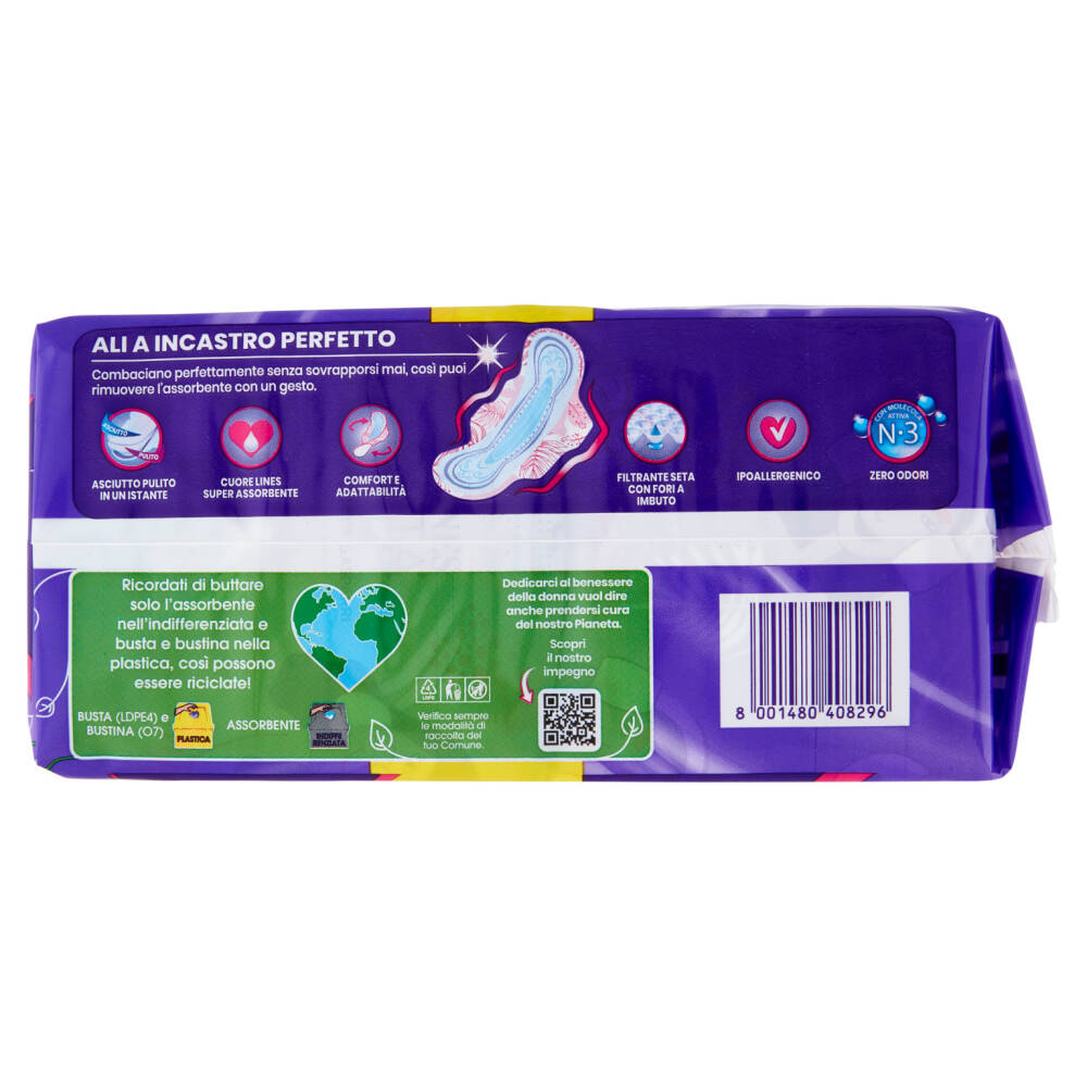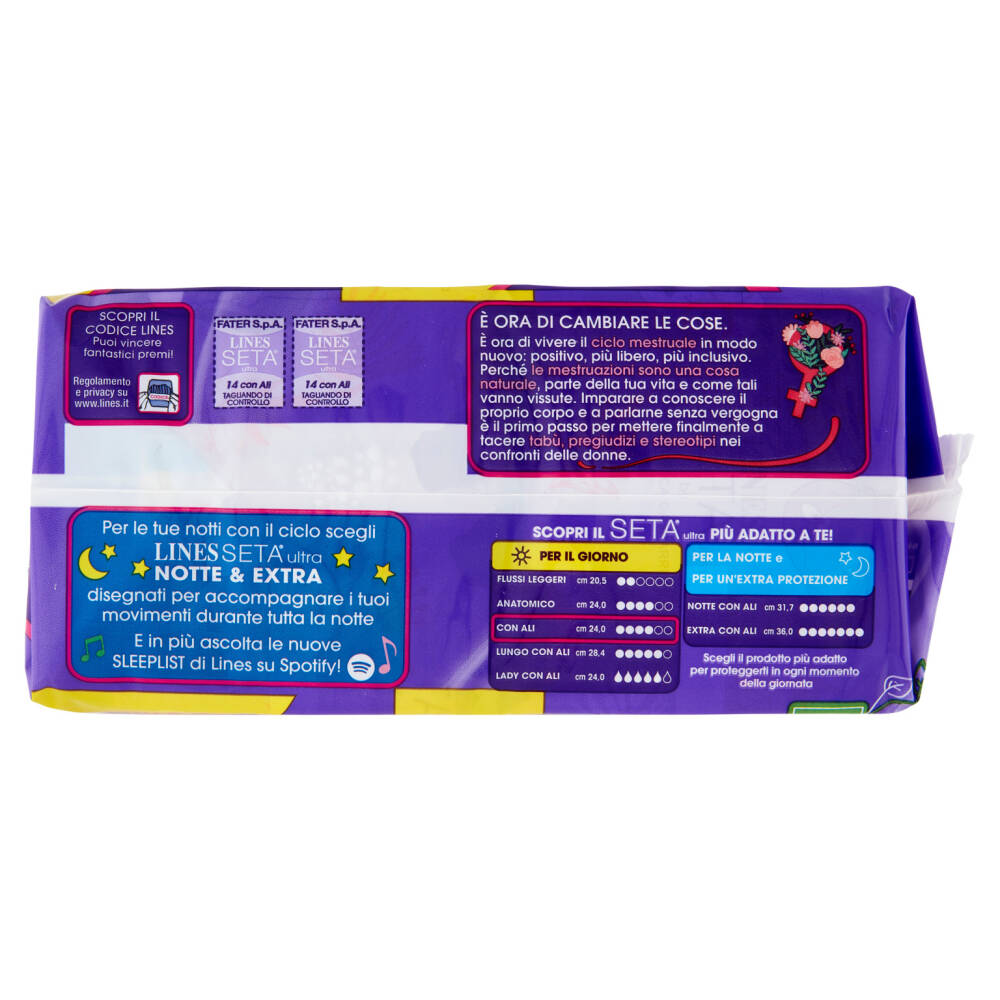 Per le tue notti con il ciclo scegli Lines Seta ultra Notte & Extra disegnati per accompagnare i tuoi movimenti durante tutta la notte