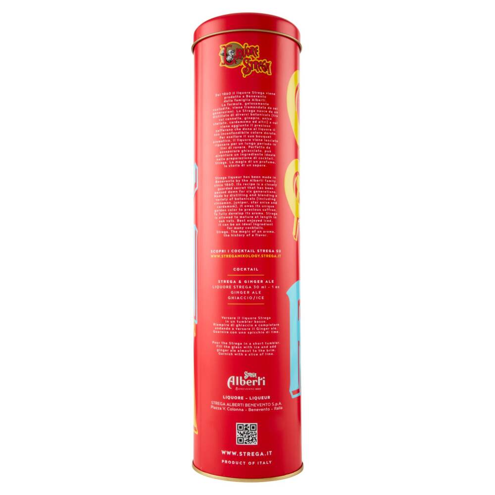 Dal 1860 il liquore Strega viene prodotto a Benevento dalla famiglia Alberti. La formula gelosamente custodita, viene tramandata da sei generazioni. Lo Strega nasce da un distillato di diversi botanicals (tra cui cannella, ginepro, anice stellato, cardamomo ed altri) a cui viene aggiunto il prezioso zafferano che dona al liquore il suo inconfondibile colore dorato. Per esaltare il suo bouquet aromatico, il liquore viene lasciato riposare per un lungo periodo in tini di rovere.