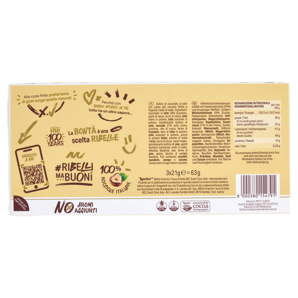 Delizie di cioccolato al latte con crema alla nocciola (54%) e fragranti cialde di wafer