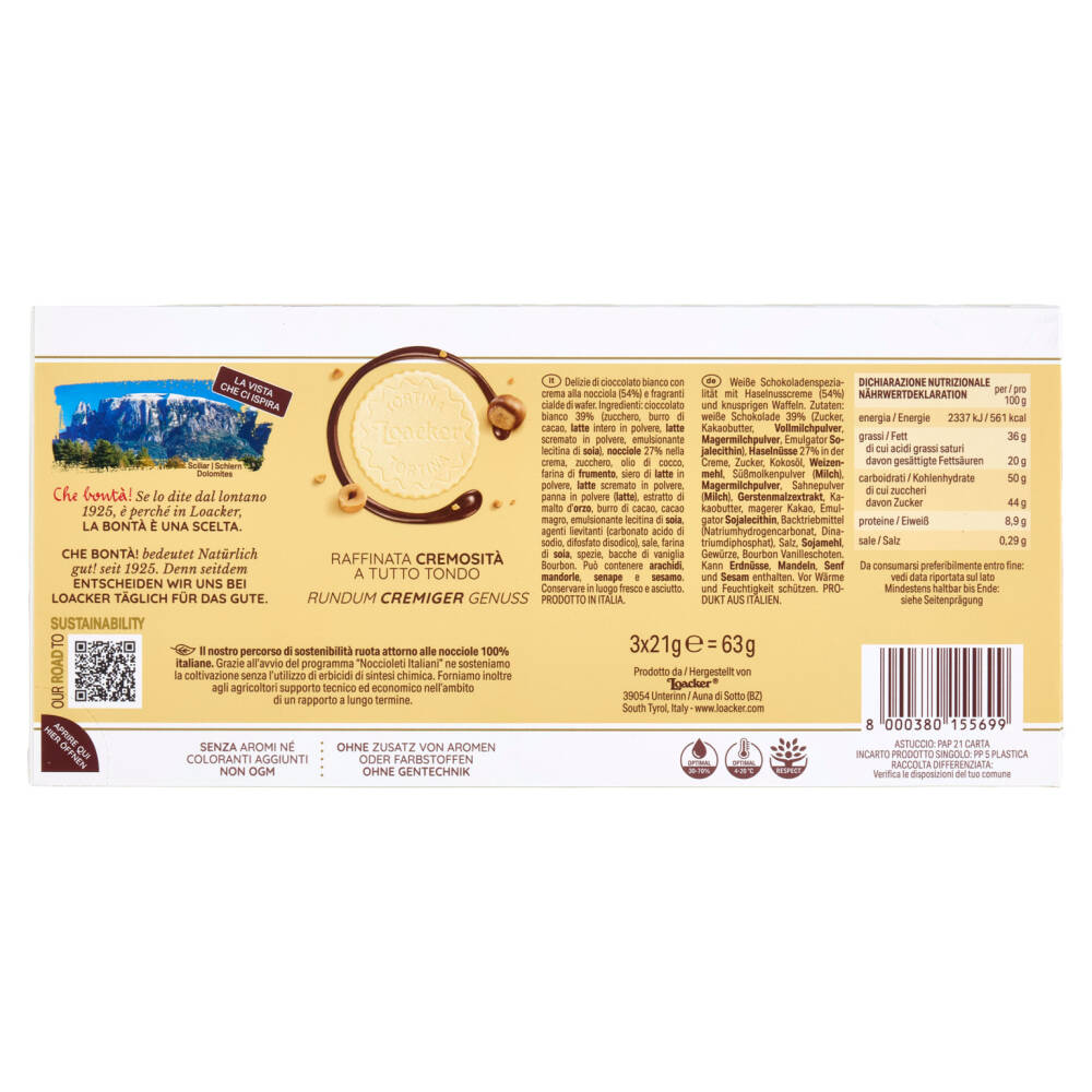 Fragranti delizie di cioccolato bianco con crema alla nocciola Scopri il percorso di sostenibilità delle nostre nocciole Con 100% nocciole italiane selezionate Cioccolato bianco con 100% latte alpino x3 Tortine confezionate singolarmente