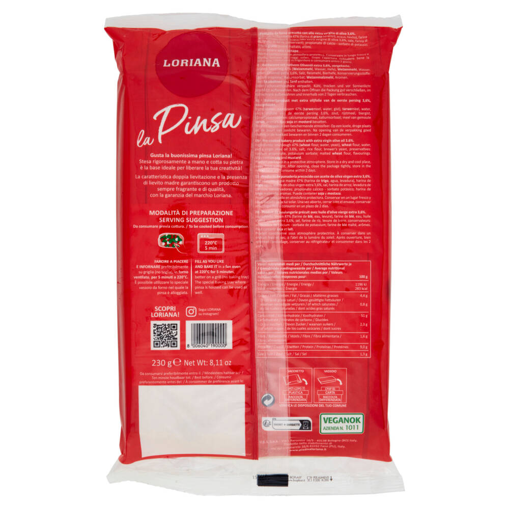 Farcire a piacere e infornare preferibilmente su griglia (no teglia), in forno ventilato, per 5 minuti a 220°C. È possibile utilizzare lo speciale vassoio da forno nel quale la pinsa è alloggiata.