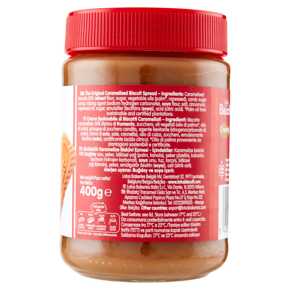 Biscotto caramellato 58% (farina di frumento, zucchero, oli vegetali (olio di palma*, olio di colza), sciroppo di zucchero candito, agente lievitante (idrogenocarbonato di sodio), farina di soia, sale, cannella) Olio di colza Zucchero Emulsionante (lecitina (soia)) Acidificante (acido citrico) *Olio di palma proveniente da piantagioni sostenibili e certificate