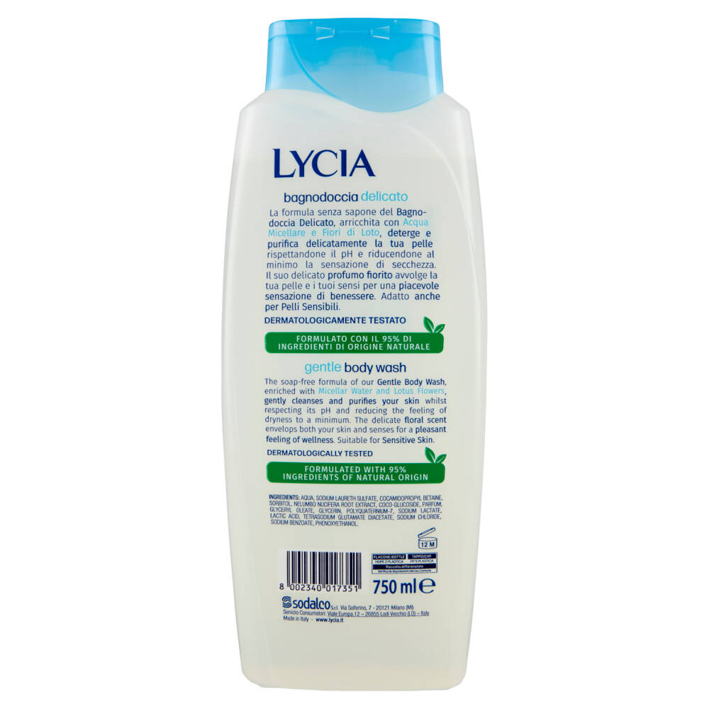 La formula senza sapone del Bagnodoccia Delicato, arricchita con Acqua Micellare e Fiori di Loto, deterge e purifica delicatamente la tua pelle rispettandone il pH e riducendone al minimo la sensazione di secchezza. Il suo delicato profumo fiorito avvolge la tua pelle e i tuoi sensi per una piacevole sensazione di benessere. Adatto anche per Pelli Sensibili.