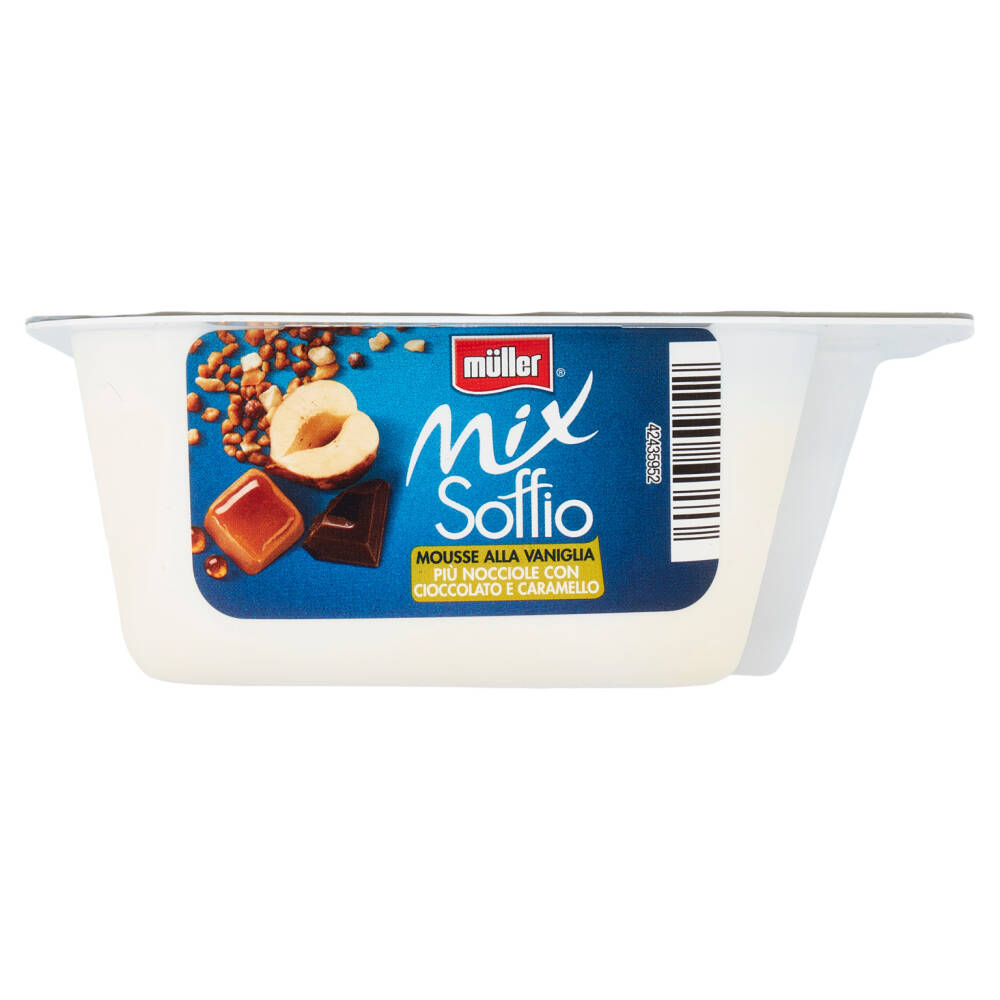 Granella di nocciole con cioccolato al latte e caramello (zucchero, 4% granella di nocciole, 1,4% cioccolato al latte (zucchero, latte intero in polvere, burro di cacao, massa di cacao, siero di latte in polvere, emulsionanti: lecitine (contiene soia), aroma), 0,1% sciroppo di caramello, aroma, burro di cacao, emulsionanti: lecitine (contiene soia))
