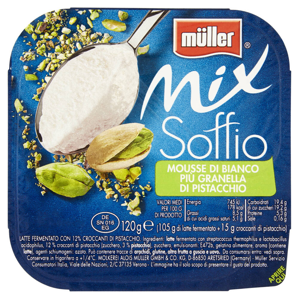 Latte fermentato con streptococcus thermophilus e lactobacillus acidophilus 12% Croccanti di pistacchio (zucchero, 3% pistacchio) Zucchero Emulsionanti: E472b Gelatina alimentare Aroma (contiene latte) Agenti schiumogeni: azoto Può contenere tracce di arachidi, glutine, altra frutta a guscio e uovo