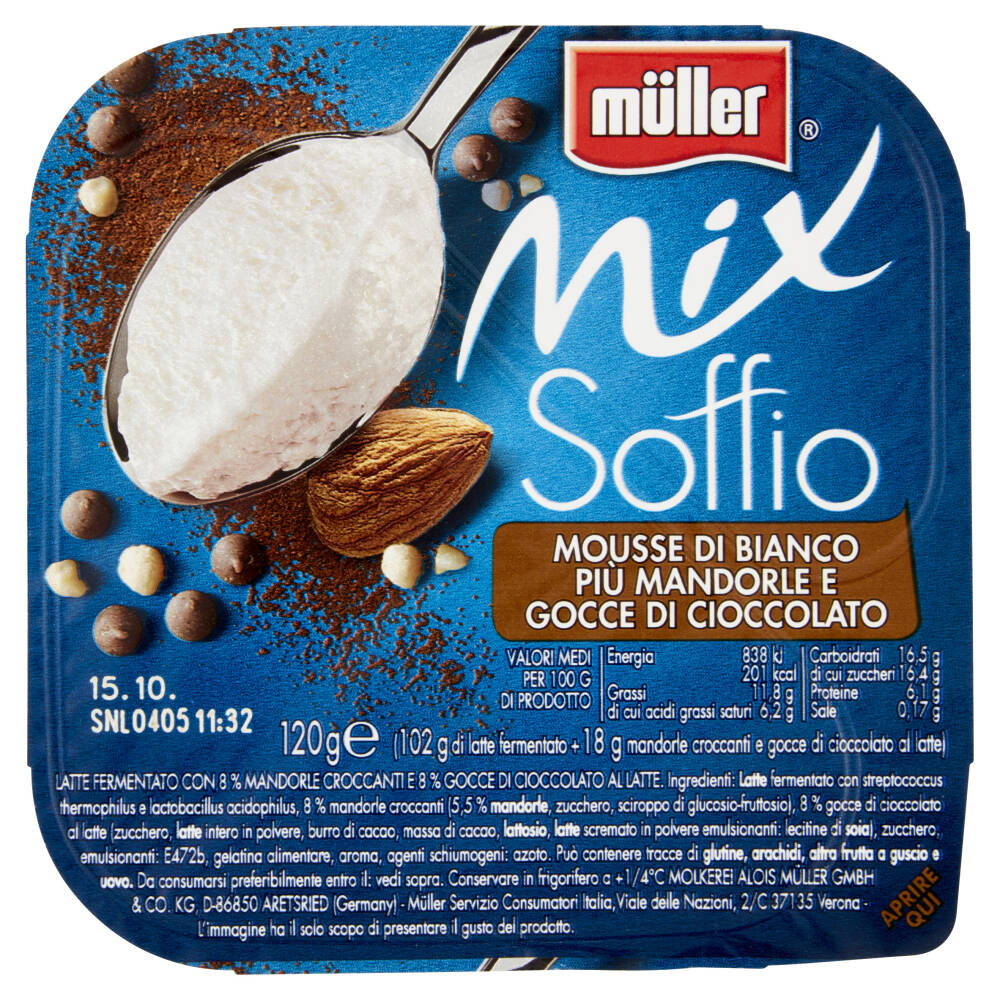 Latte fermentato con streptococcus thermophilus e lactobacillus acidophilus 8% Mandorle croccanti (5,5% mandorle, zucchero, sciroppo di glucosio-fruttosio) 8% Gocce di cioccolato al latte (zucchero, latte intero in polvere, burro di cacao, massa di cacao, lattosio, latte scremato in polvere emulsionanti: lecitine di soia) Zucchero Emulsionanti: E472b Gelatina alimentare Aroma Agenti schiumogeni: azoto Può contenere tracce di glutine, arachidi, altra frutta a guscio e uovo
