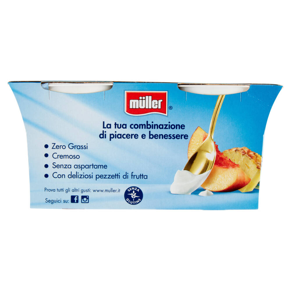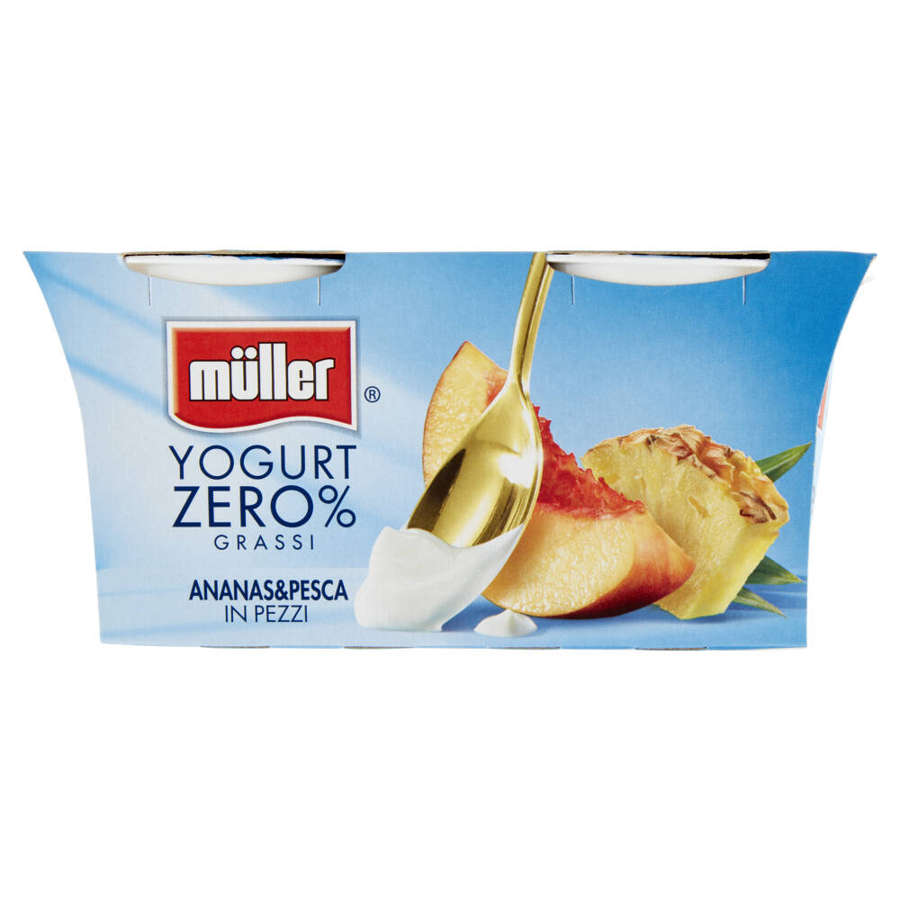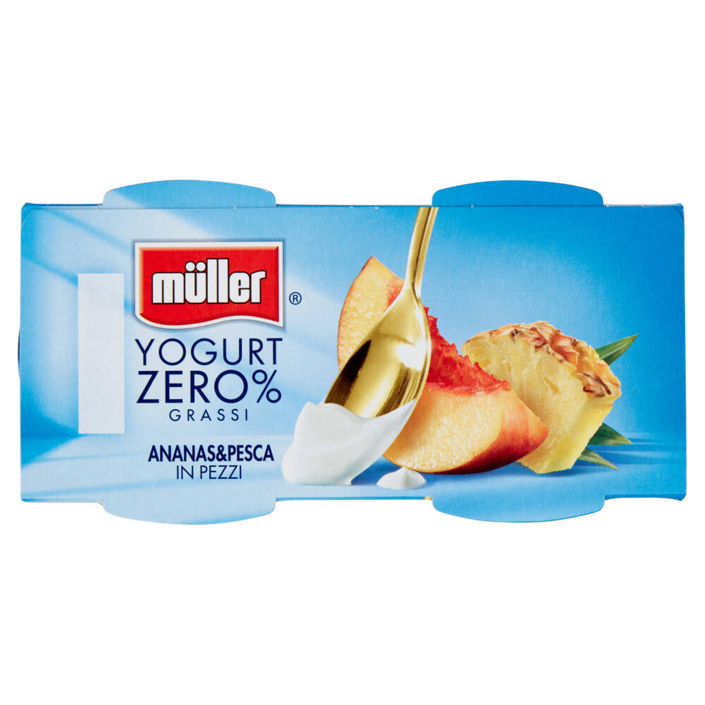 Yogurt magro Preparazione alla pesca e ananas (acqua, 25% pesca, zucchero, 20% ananas, amidi, succo di limone da concentrato, addensanti pectine, aroma (contiene latte)) Zucchero Destrosio Aroma naturale Senza glutine